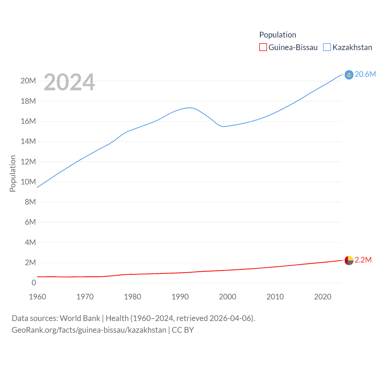 Guinea-Bissau has a population of 2.2M (ranked 146/197), compared with 20.6M in Kazakhstan (ranked 64/197). Guinea-Bissau's land area is 10,857 sq mi versus 1,042,360 sq mi for Kazakhstan (ranked 139th vs. 9th).