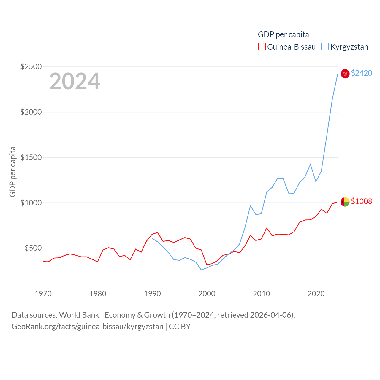 By GDP, Guinea-Bissau ranks 176/197 ($2.22B) and Kyrgyzstan ranks 135/197 ($17.5B). By GDP per capita, Guinea-Bissau ranks 177/197 ($1,008), while Kyrgyzstan ranks 150/197 ($2,420).