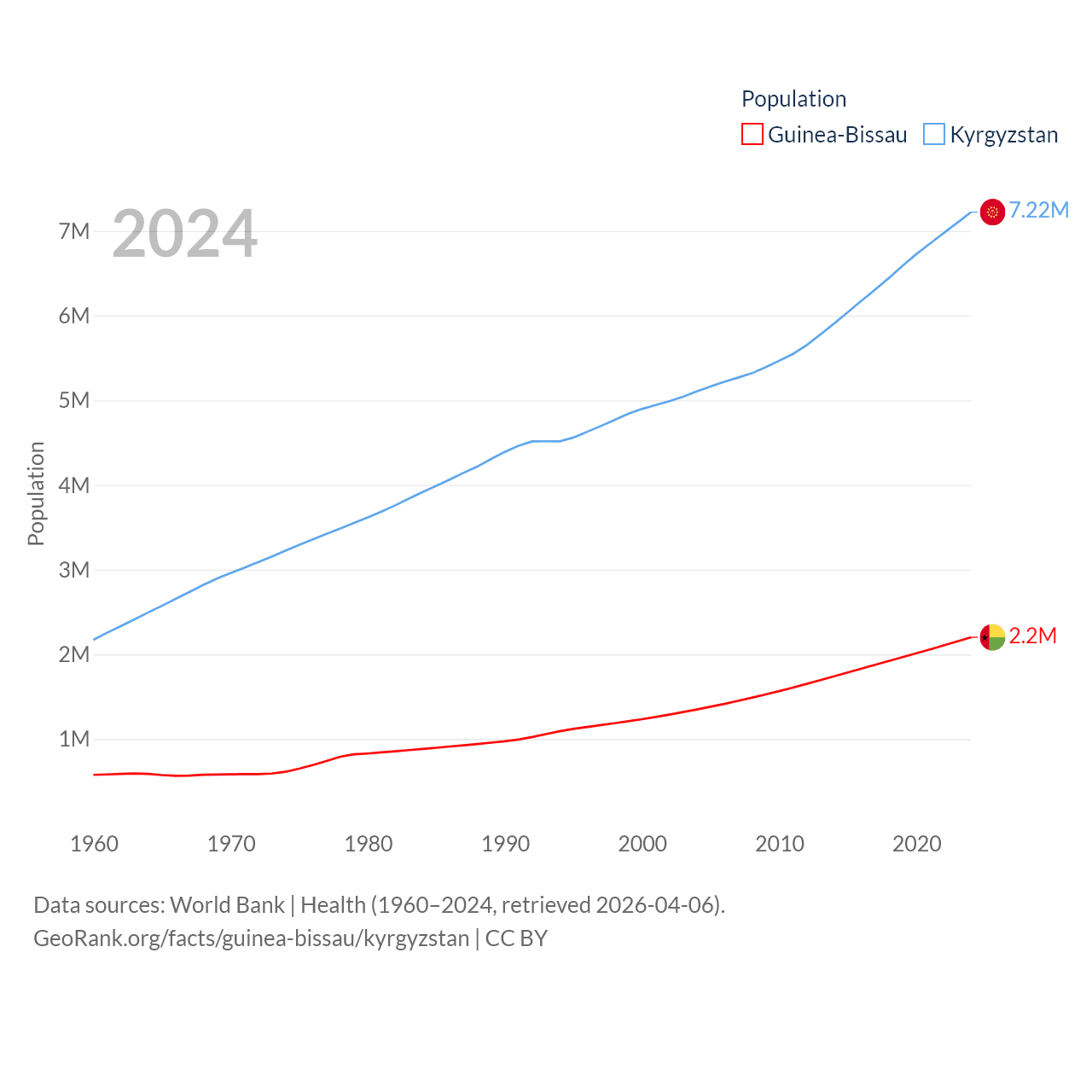 Guinea-Bissau has a population of 2.2M (ranked 146/197), compared with 7.22M in Kyrgyzstan (ranked 106/197). Guinea-Bissau's land area is 10,857 sq mi versus 74,054 sq mi for Kyrgyzstan (ranked 139th vs. 86th).