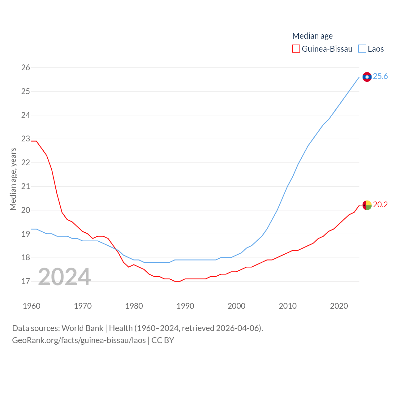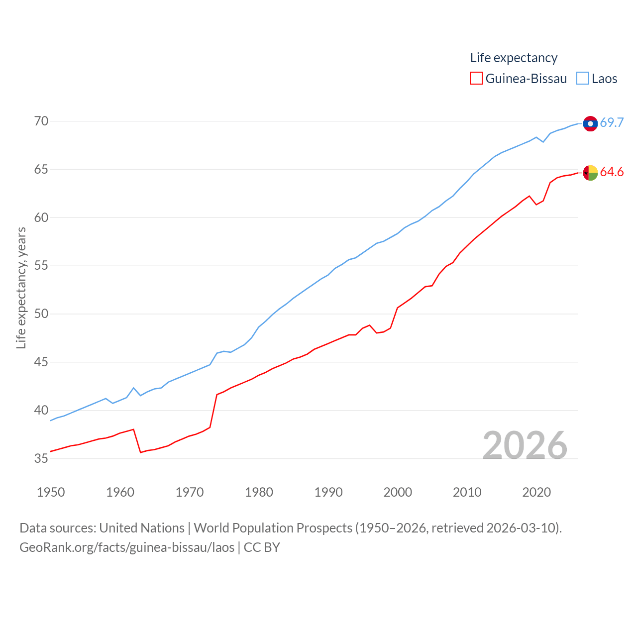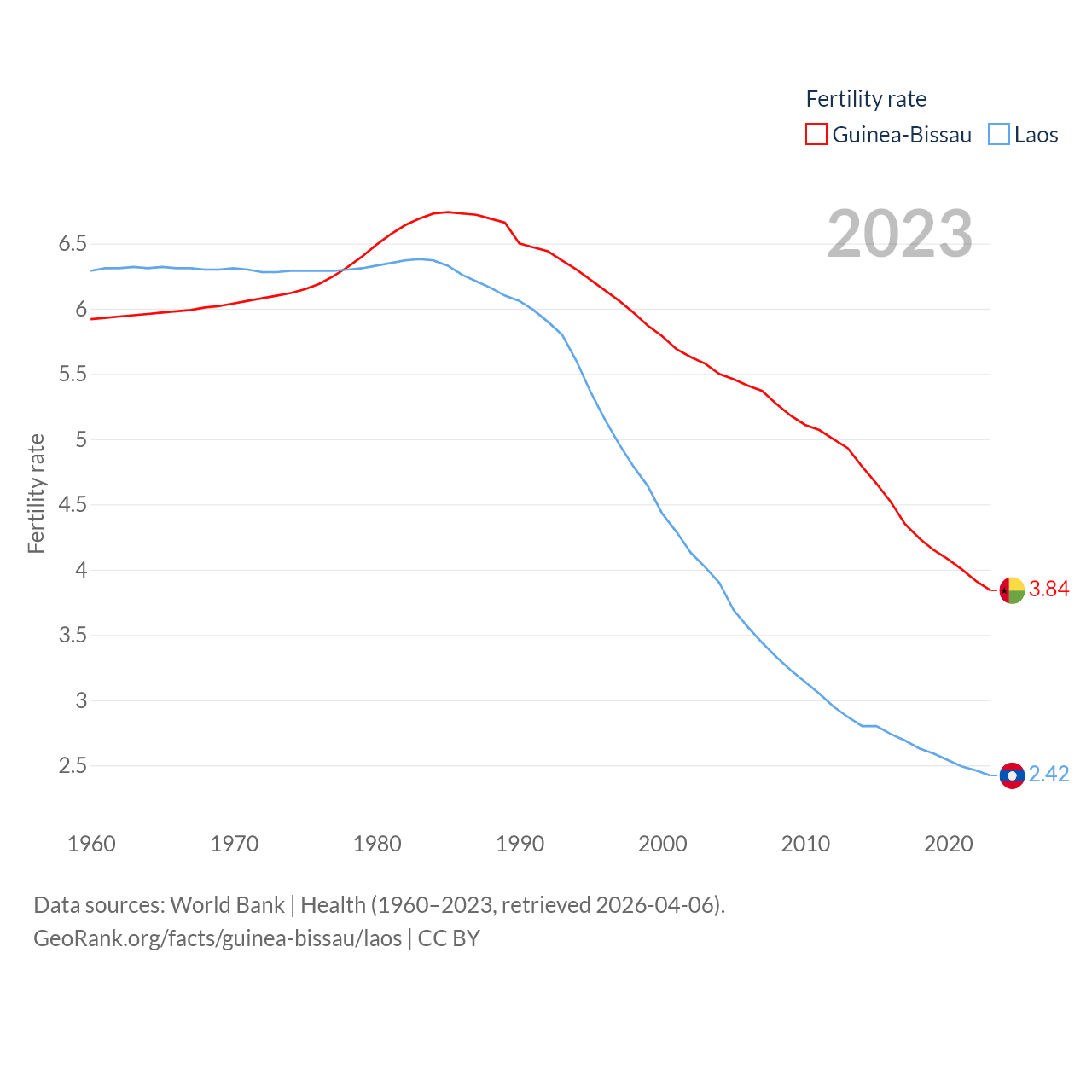 Guinea-Bissau has a population of 2.2M (ranked 146/197), compared with 7.77M in Laos (ranked 103/197). Guinea-Bissau's land area is 10,857 sq mi versus 89,112 sq mi for Laos (ranked 139th vs. 79th).