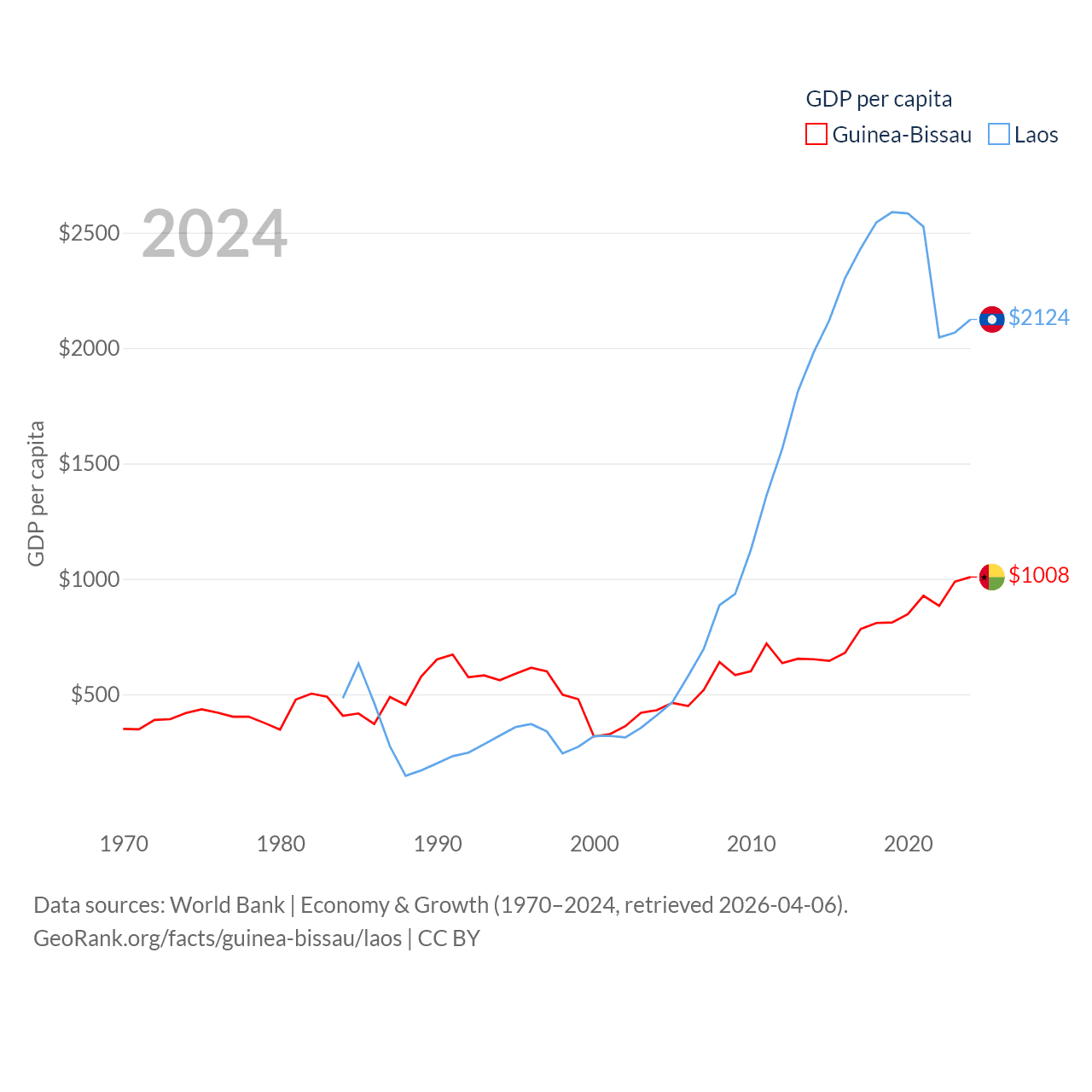 By GDP, Guinea-Bissau ranks 176/197 ($2.22B) and Laos ranks 139/197 ($16.5B). By GDP per capita, Guinea-Bissau ranks 177/197 ($1,008), while Laos ranks 155/197 ($2,124).