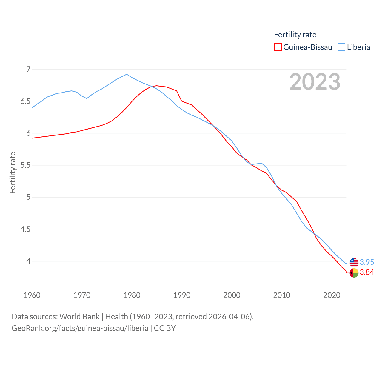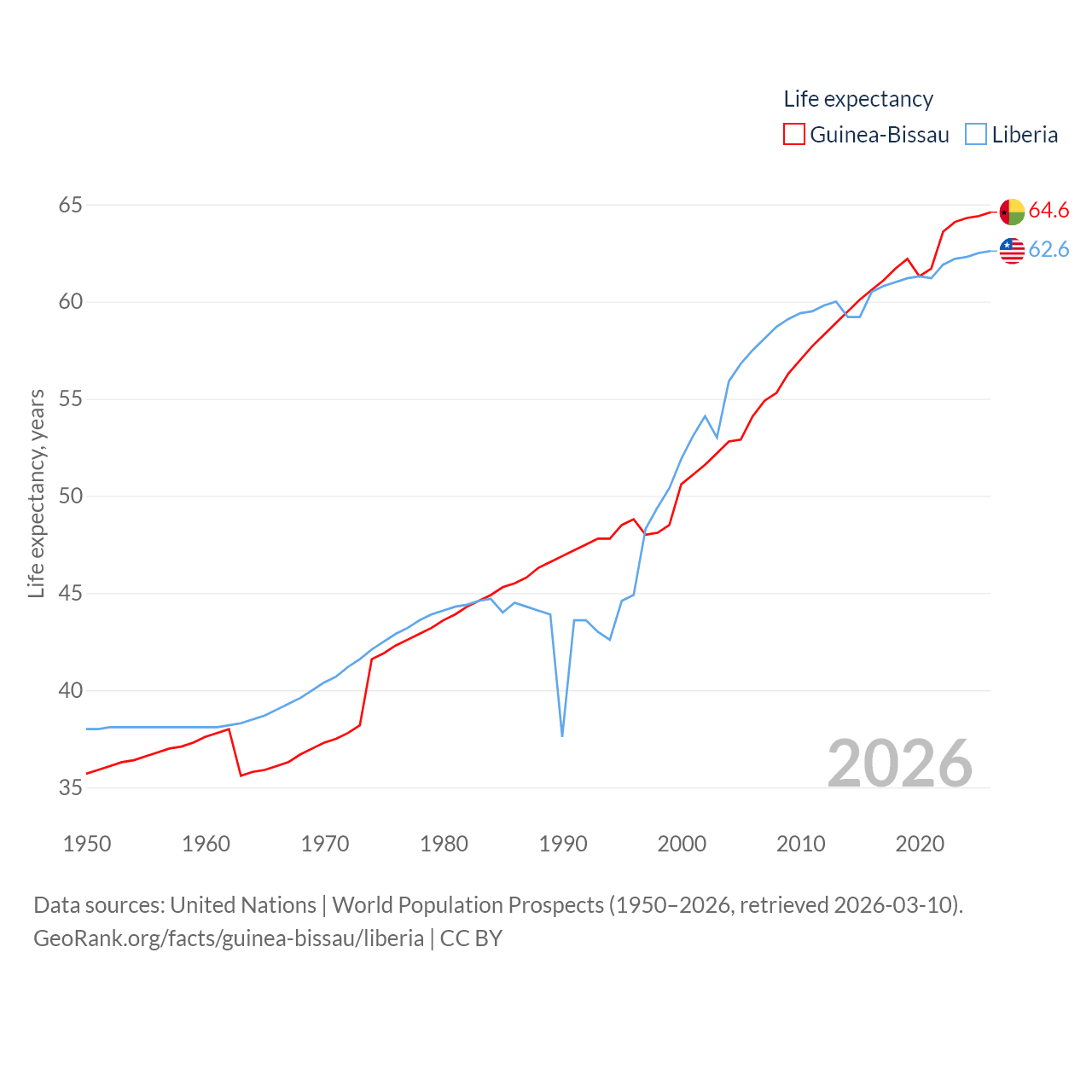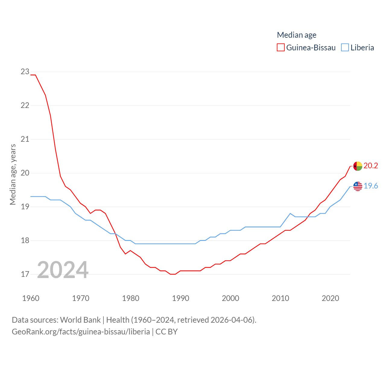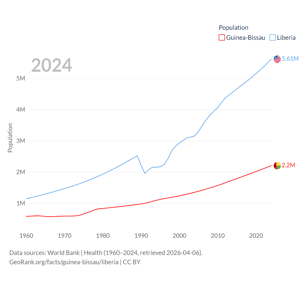 Guinea-Bissau has a population of 2.2M (ranked 146/197), compared with 5.61M in Liberia (ranked 117/197). Guinea-Bissau's land area is 10,857 sq mi versus 37,189 sq mi for Liberia (ranked 139th vs. 106th).
