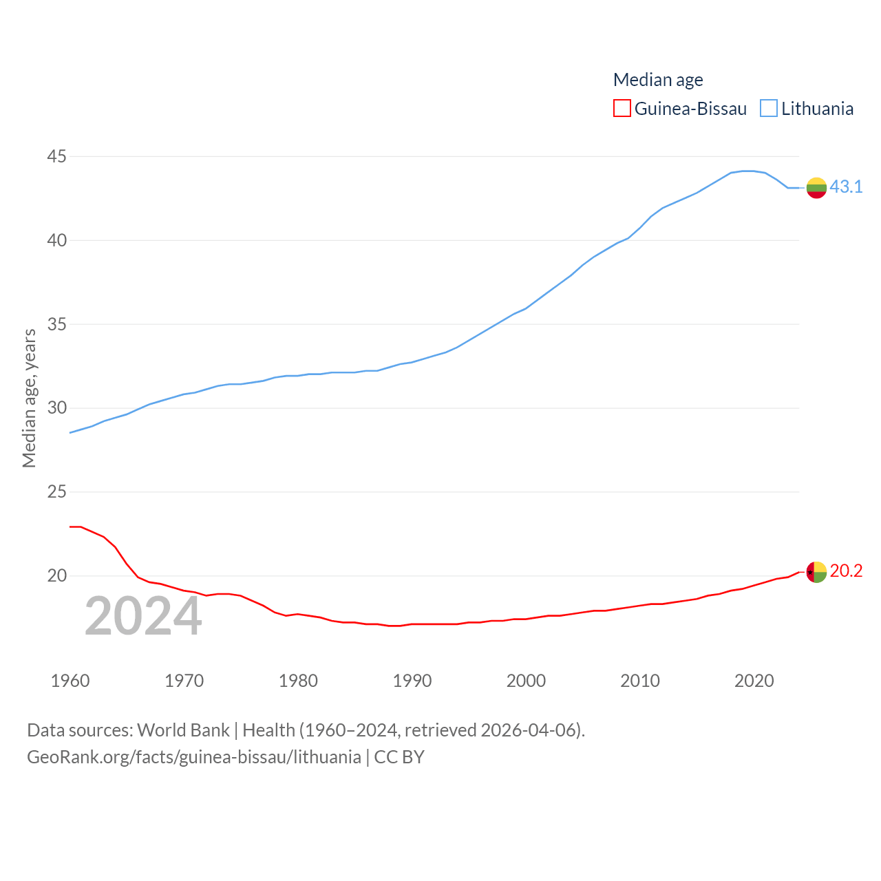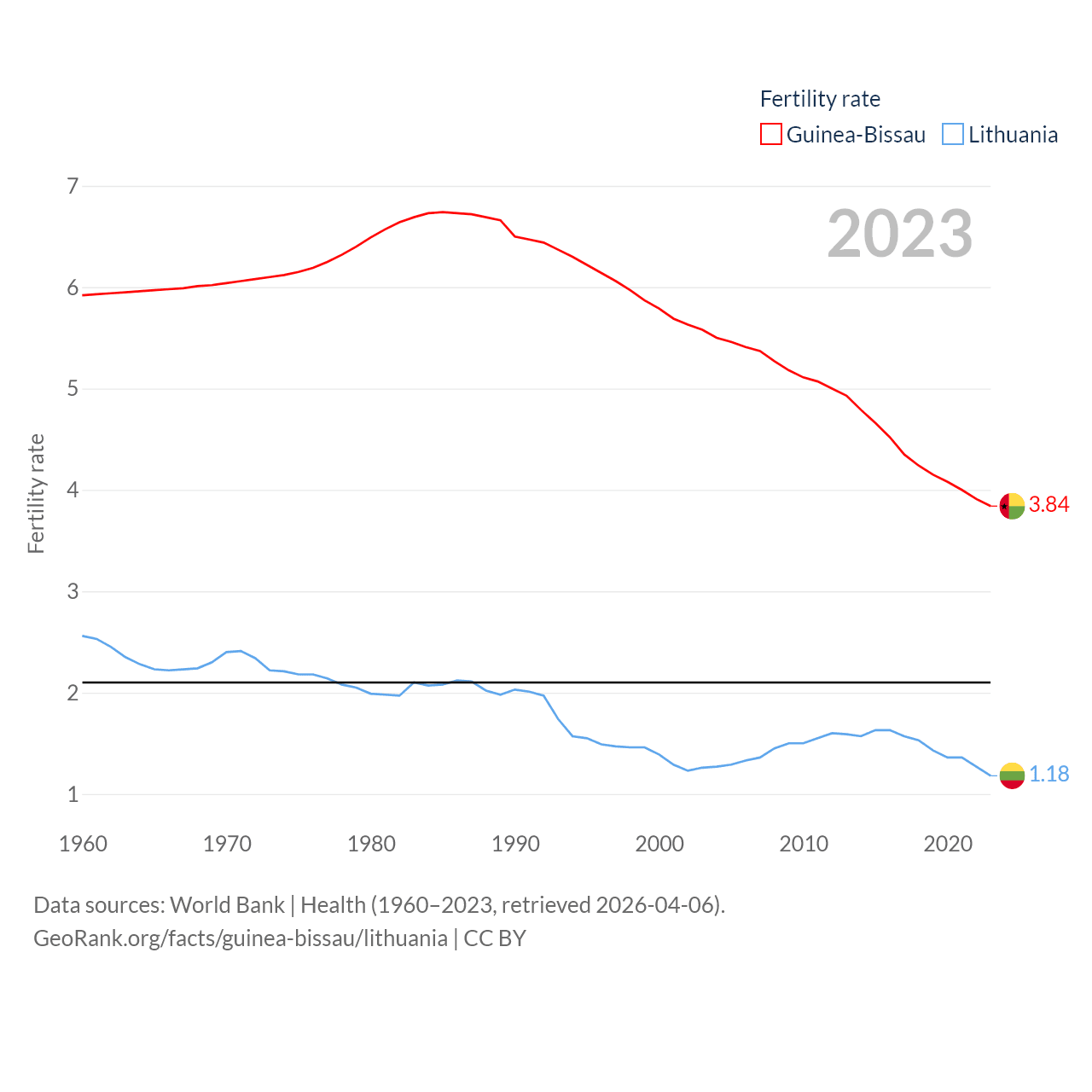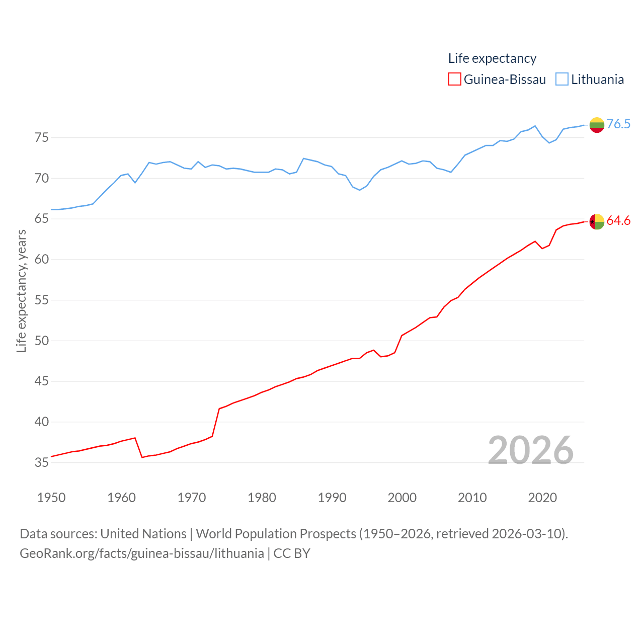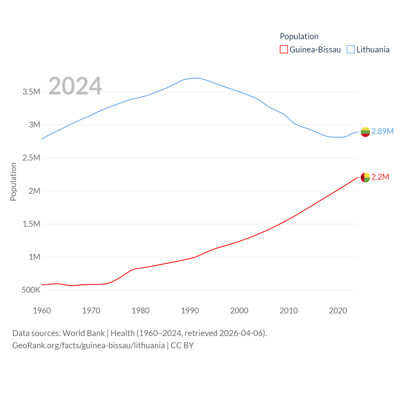 Guinea-Bissau has a population of 2.2M (ranked 146/197), compared with 2.89M in Lithuania (ranked 137/197). Guinea-Bissau's land area is 10,857 sq mi versus 24,170 sq mi for Lithuania (ranked 139th vs. 120th).