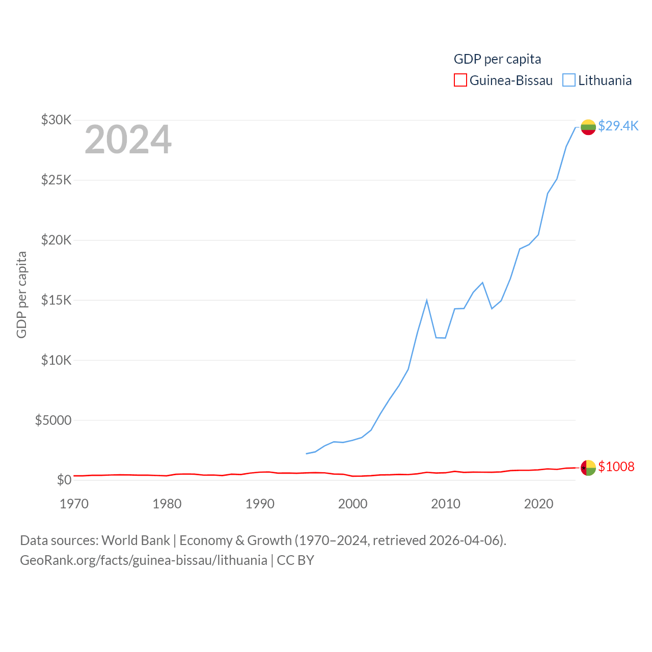 By GDP, Guinea-Bissau ranks 176/197 ($2.22B) and Lithuania ranks 79/197 ($84.9B). By GDP per capita, Guinea-Bissau ranks 177/197 ($1,008), while Lithuania ranks 43/197 ($29,384).