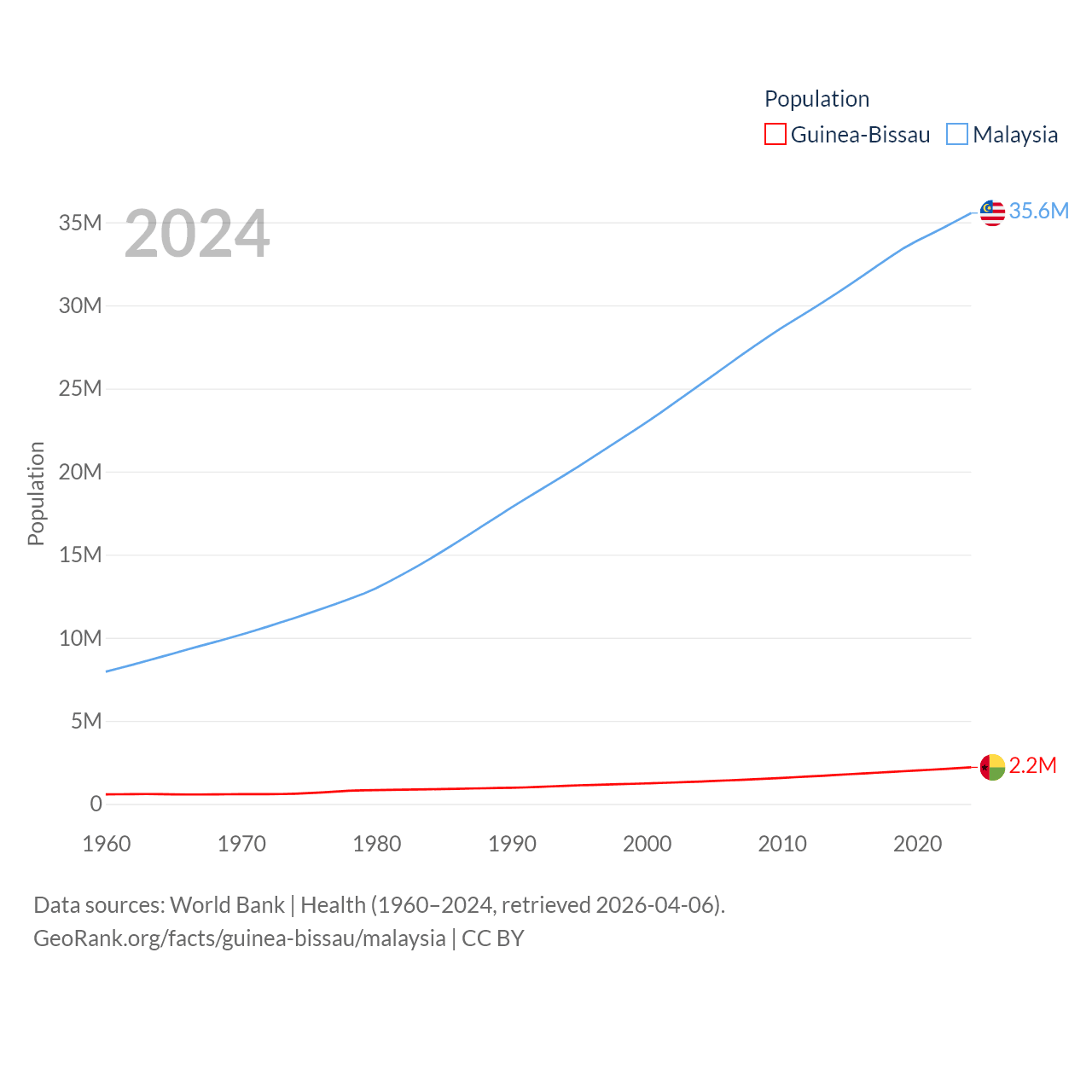 Guinea-Bissau has a population of 2.2M (ranked 146/197), compared with 35.6M in Malaysia (ranked 44/197). Guinea-Bissau's land area is 10,857 sq mi versus 126,854 sq mi for Malaysia (ranked 139th vs. 65th).
