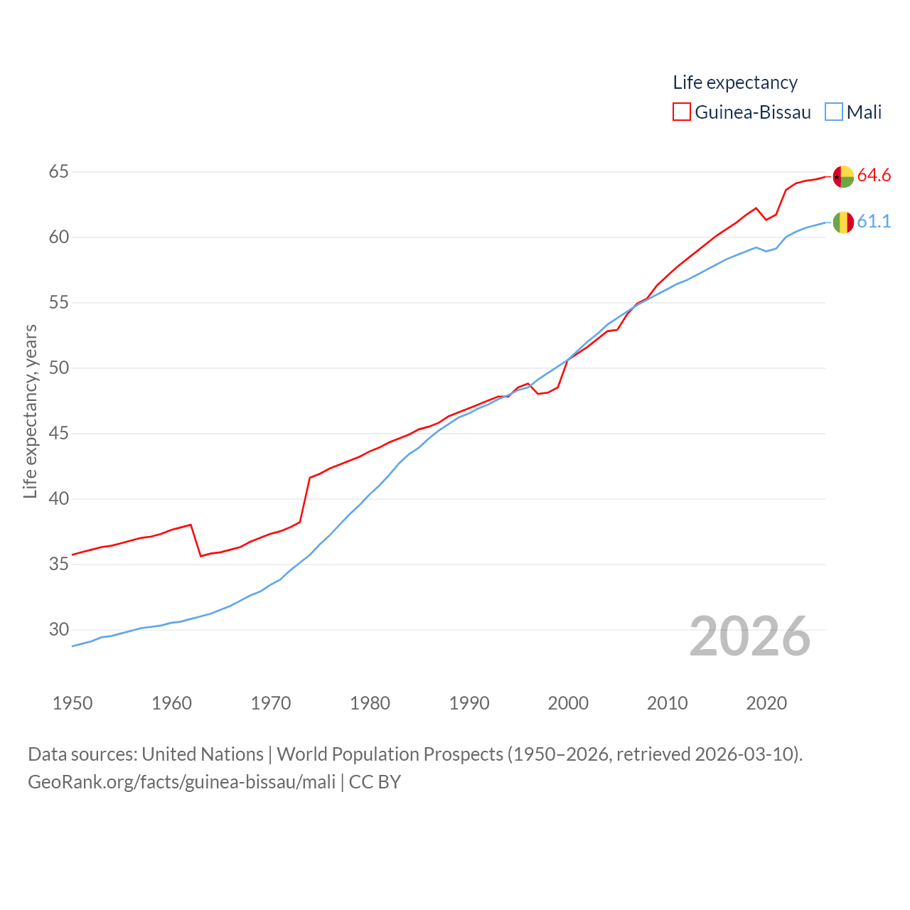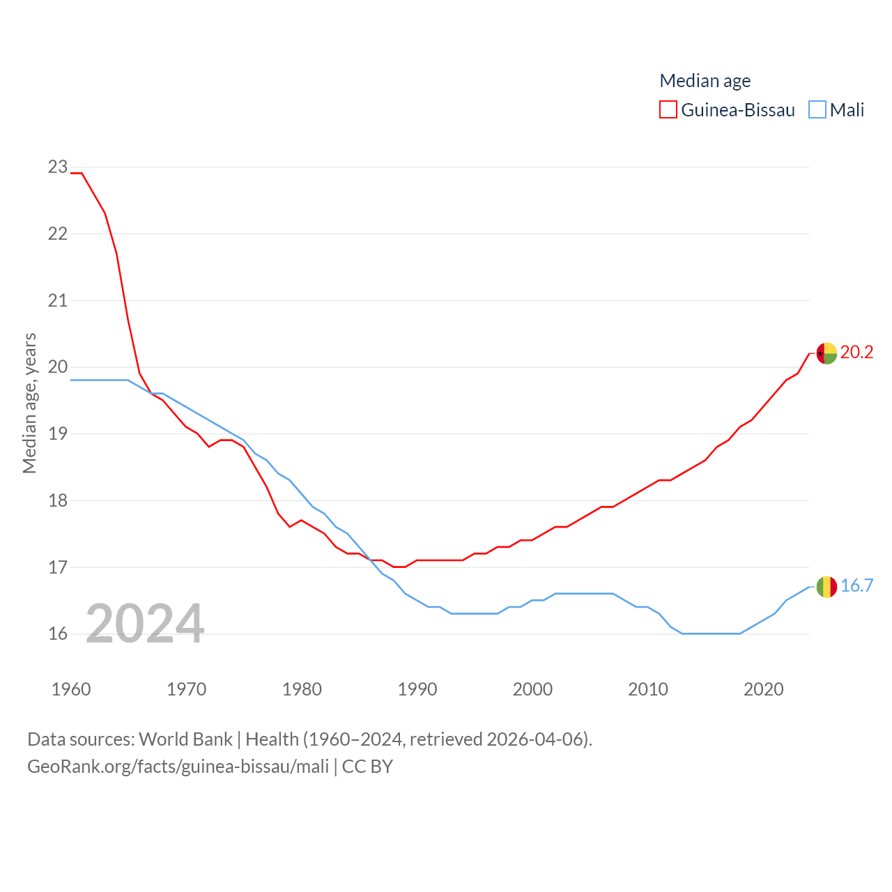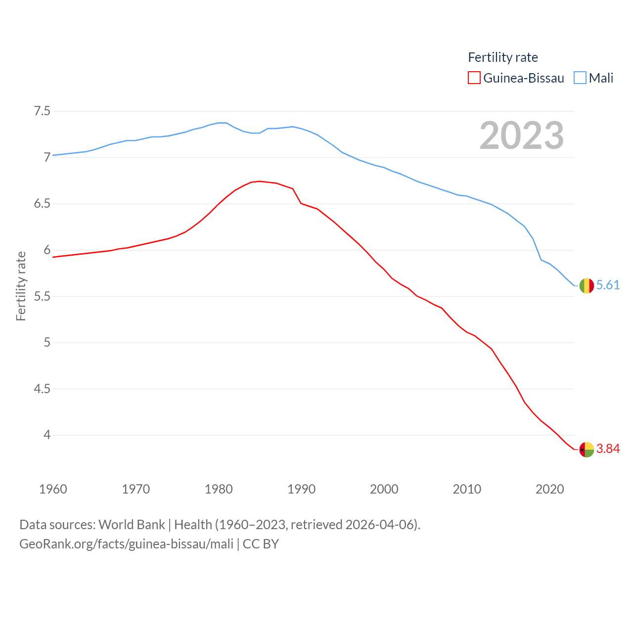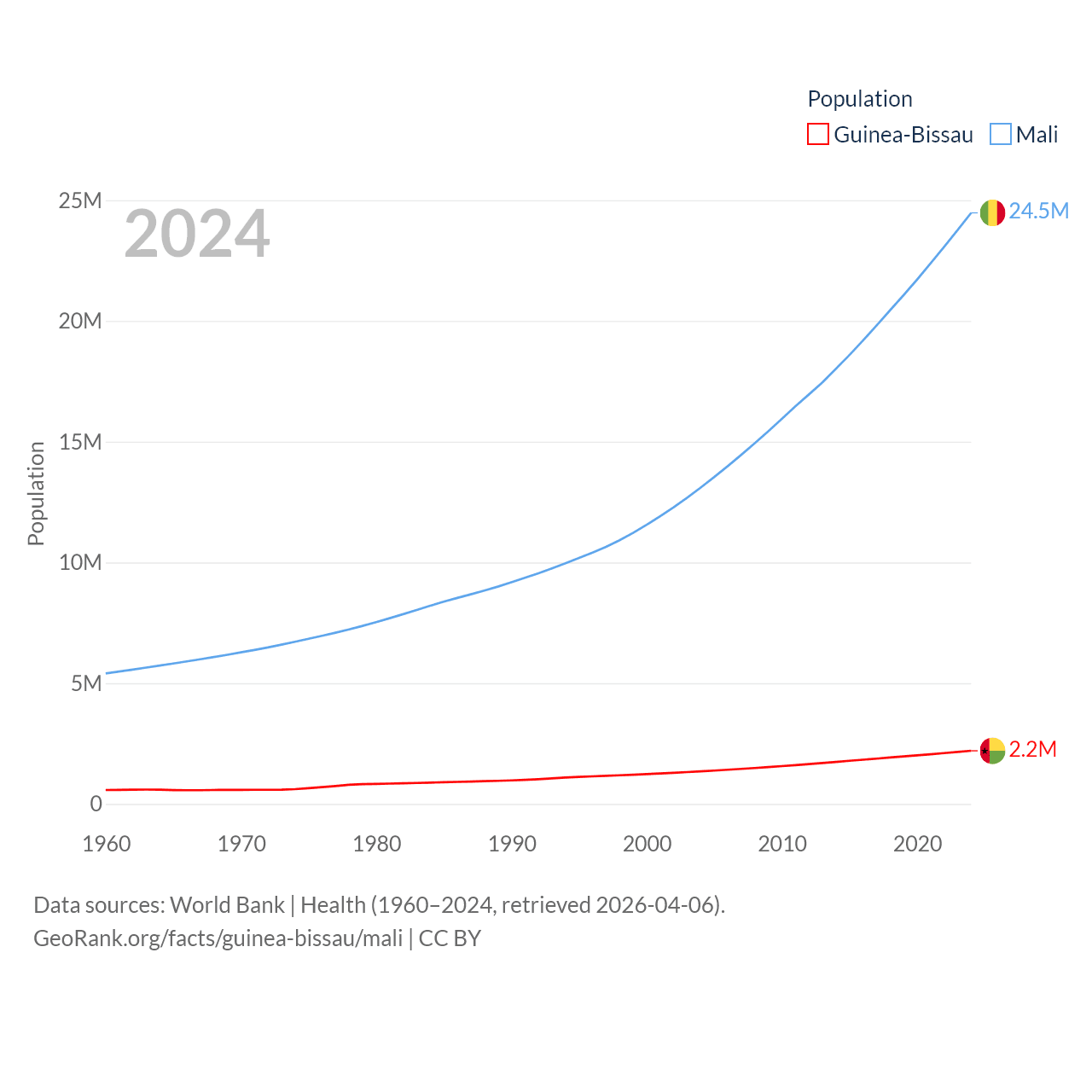 Guinea-Bissau has a population of 2.2M (ranked 146/197), compared with 24.5M in Mali (ranked 58/197). Guinea-Bissau's land area is 10,857 sq mi versus 471,118 sq mi for Mali (ranked 139th vs. 23rd).