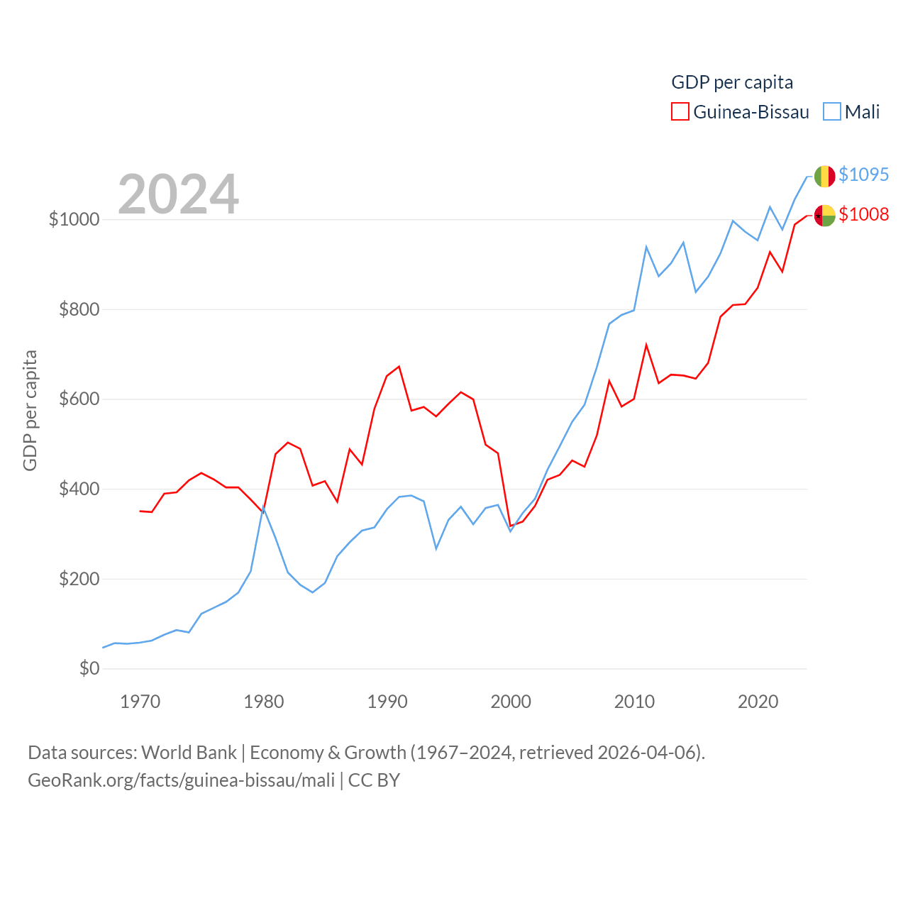 By GDP, Guinea-Bissau ranks 176/197 ($2.22B) and Mali ranks 113/197 ($26.8B). By GDP per capita, Guinea-Bissau ranks 177/197 ($1,008), while Mali ranks 173/197 ($1,095).