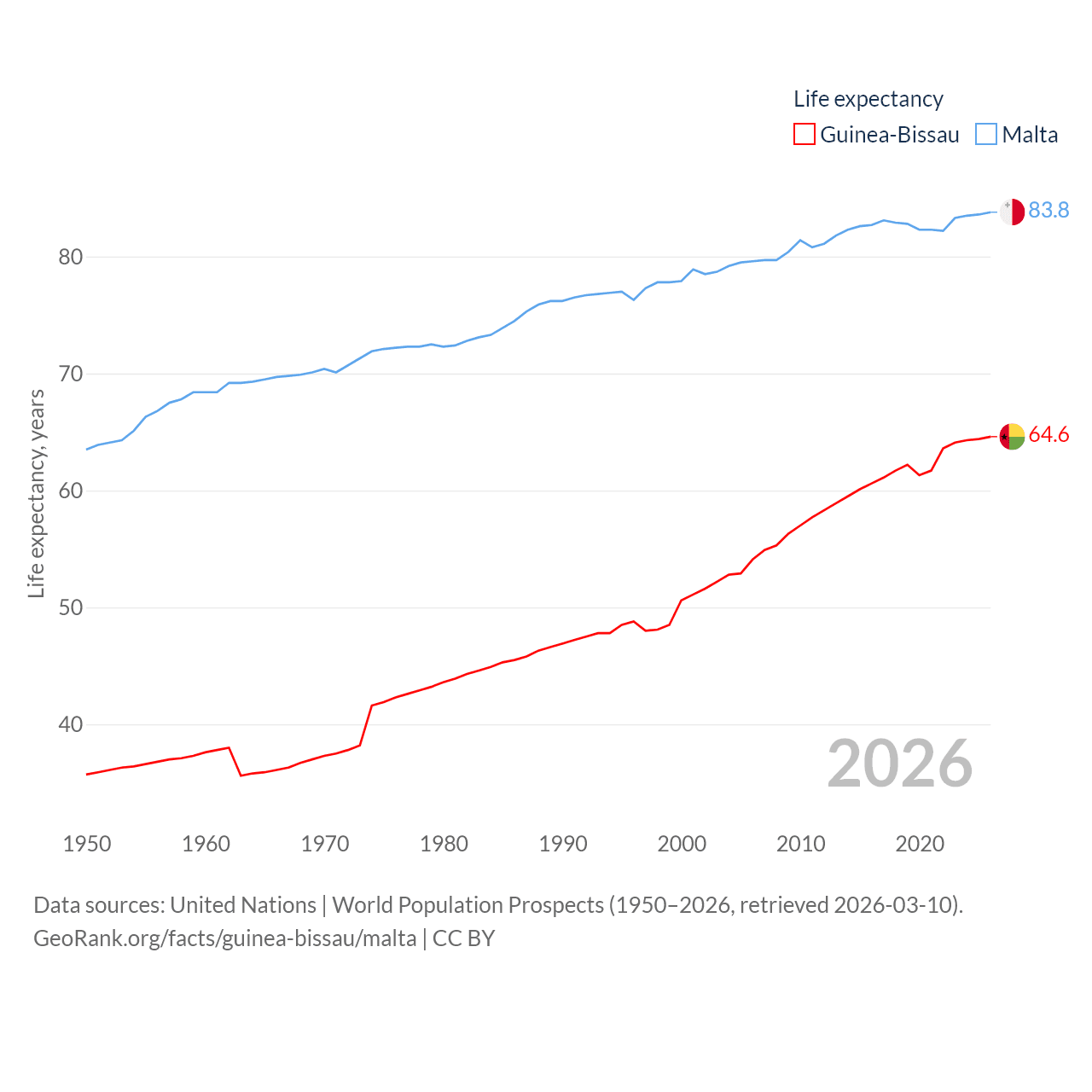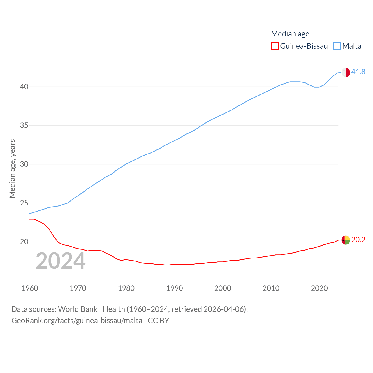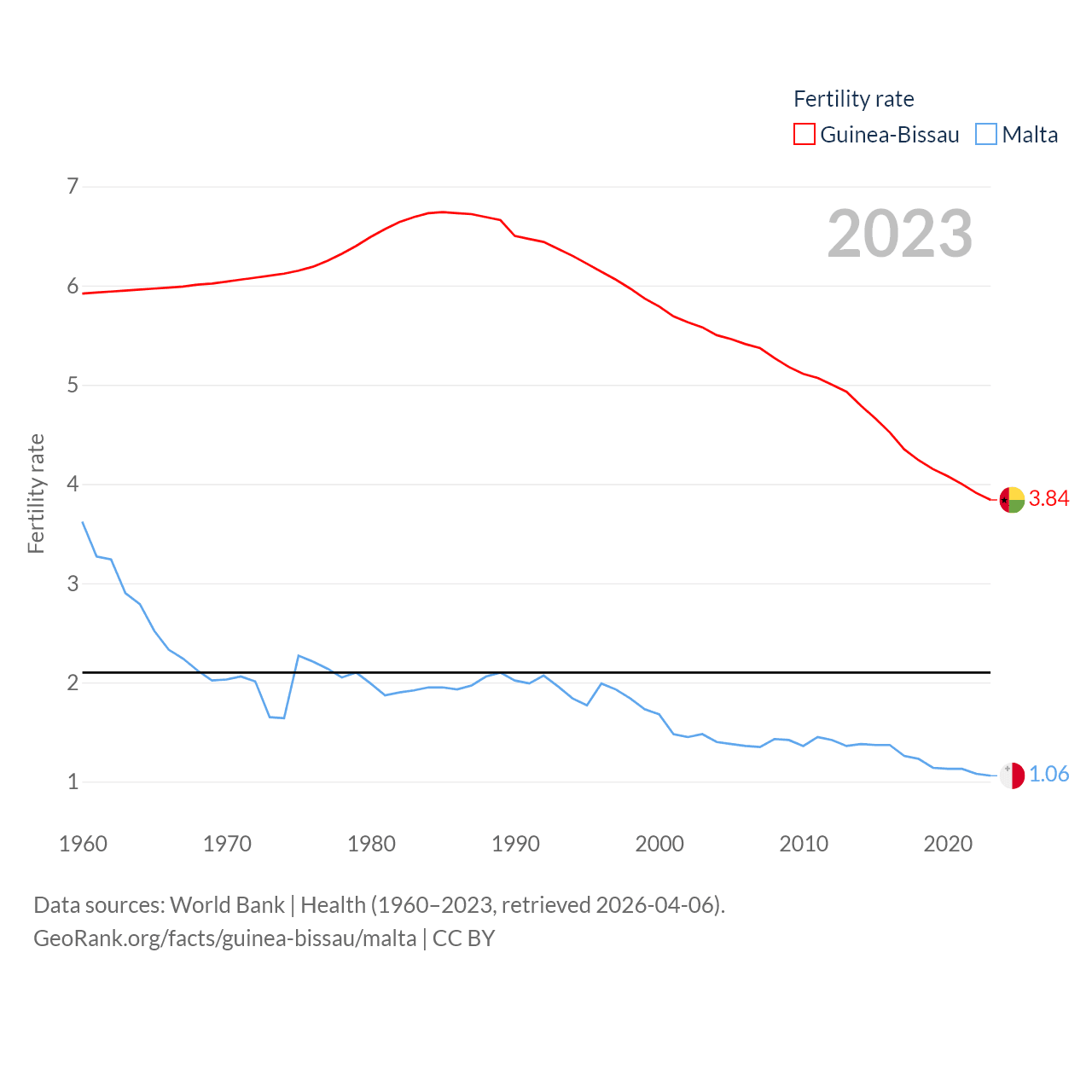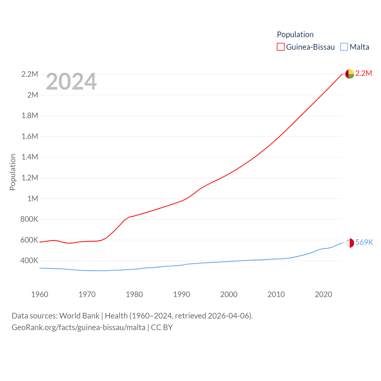 Guinea-Bissau has a population of 2.2M (ranked 146/197), compared with 569K in Malta (ranked 167/197). Guinea-Bissau's land area is 10,857 sq mi versus 123.6 sq mi for Malta (ranked 139th vs. 187th).