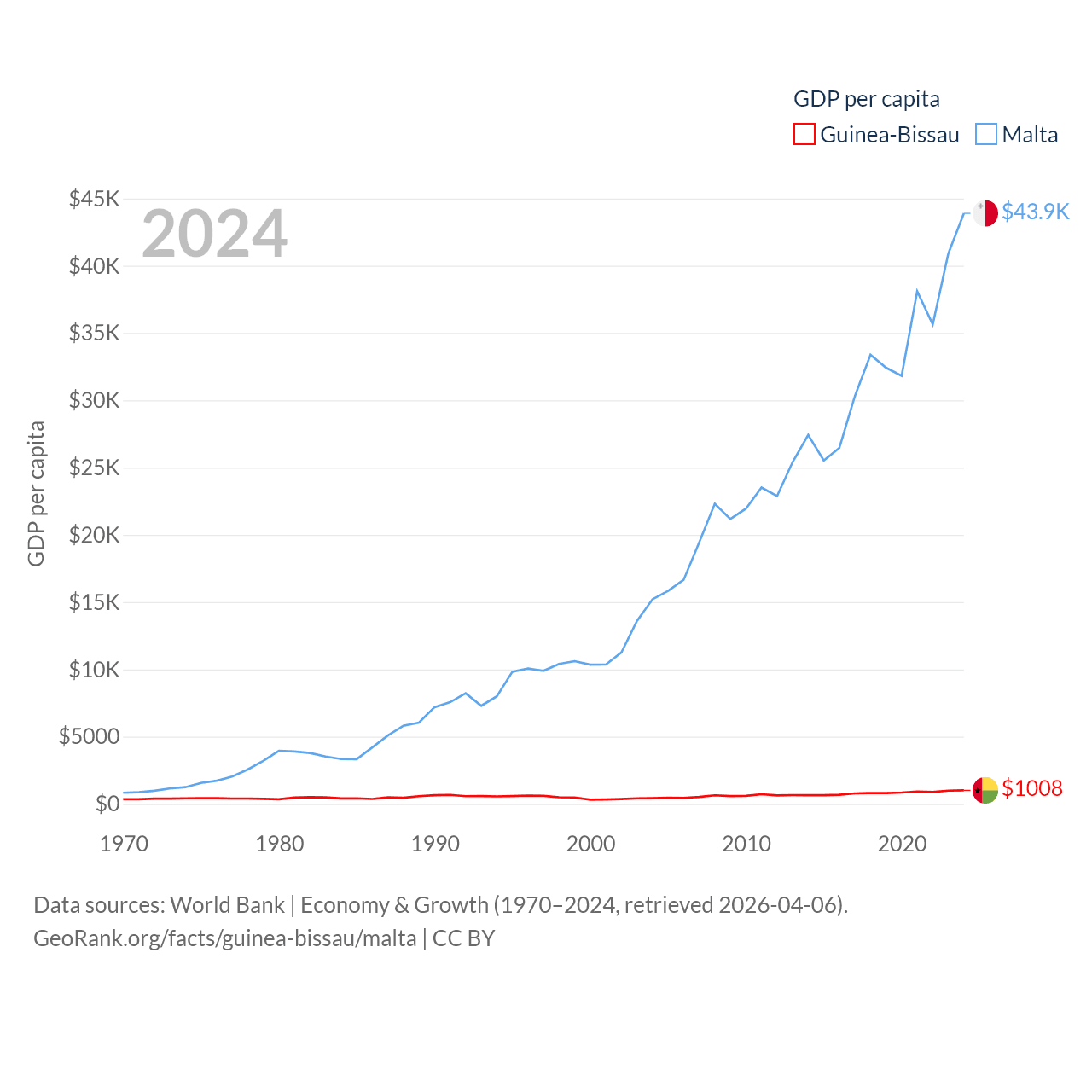 By GDP, Guinea-Bissau ranks 176/197 ($2.22B) and Malta ranks 119/197 ($25B). By GDP per capita, Guinea-Bissau ranks 177/197 ($1,008), while Malta ranks 28/197 ($43,899).