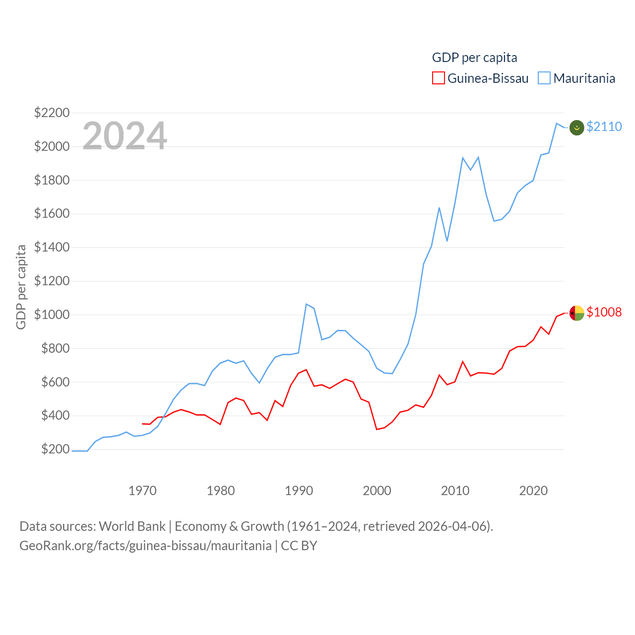 By GDP, Guinea-Bissau ranks 176/197 ($2.22B) and Mauritania ranks 153/197 ($10.9B). By GDP per capita, Guinea-Bissau ranks 177/197 ($1,008), while Mauritania ranks 156/197 ($2,110).