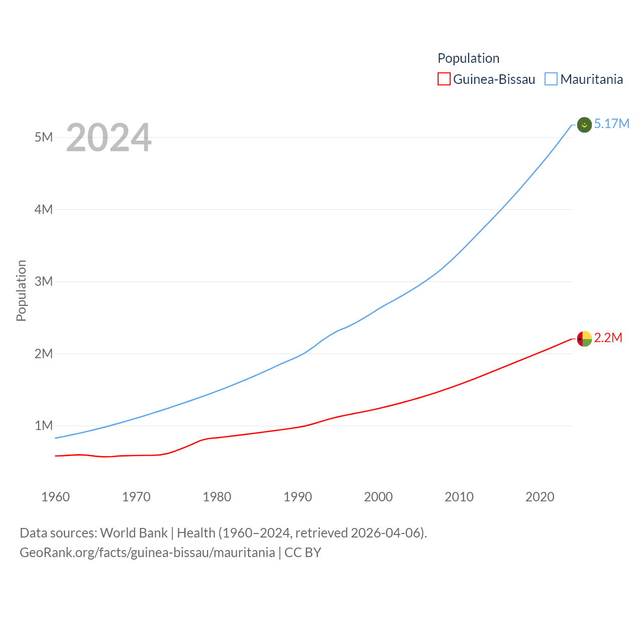 Guinea-Bissau has a population of 2.2M (ranked 146/197), compared with 5.17M in Mauritania (ranked 125/197). Guinea-Bissau's land area is 10,857 sq mi versus 397,955 sq mi for Mauritania (ranked 139th vs. 28th).