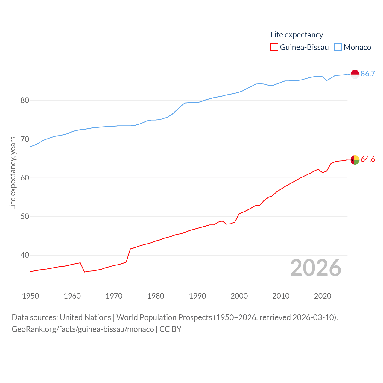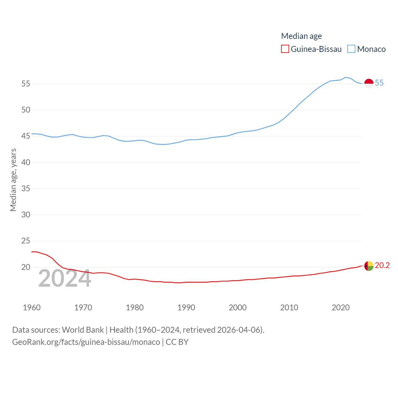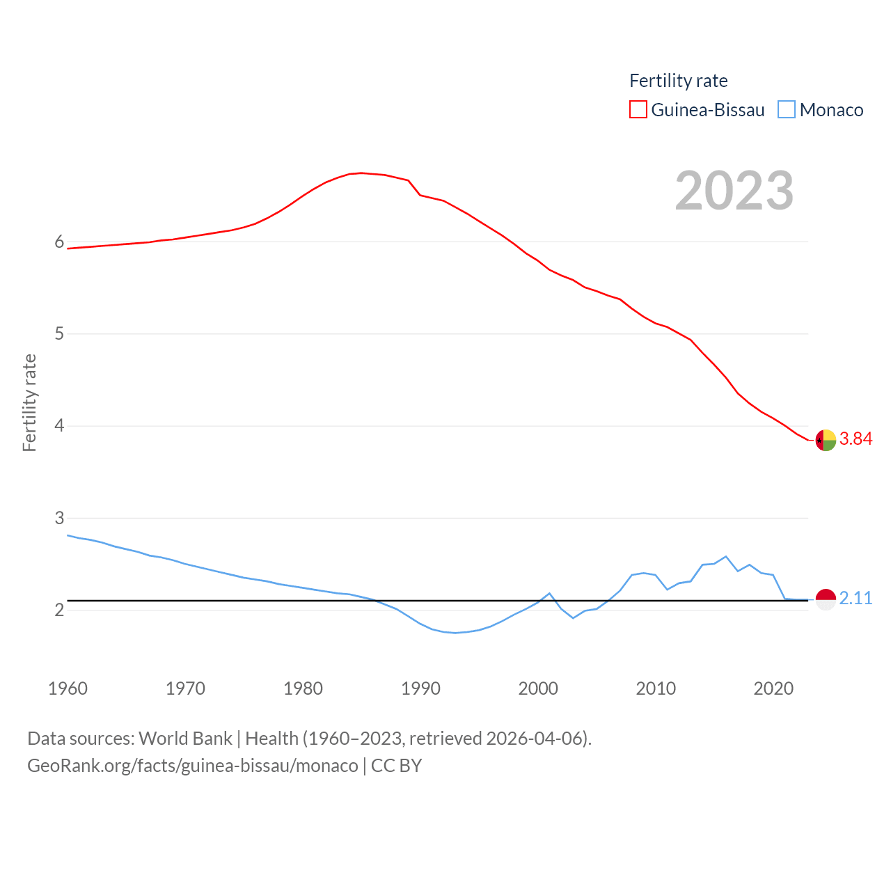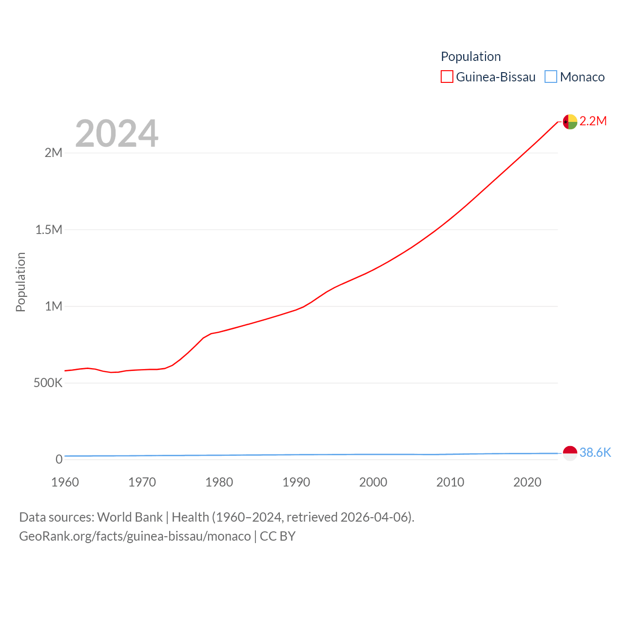 Guinea-Bissau has a population of 2.2M (ranked 146/197), compared with 38.6K in Monaco (ranked 191/197). Guinea-Bissau's land area is 10,857 sq mi versus 0.8 sq mi for Monaco (ranked 139th vs. 196th).