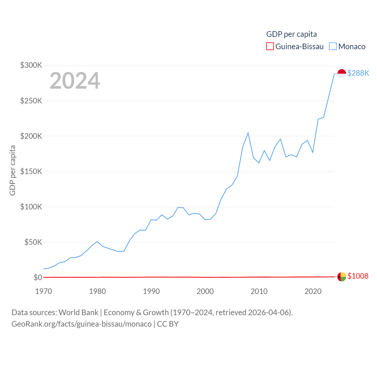 By GDP, Guinea-Bissau ranks 176/197 ($2.22B) and Monaco ranks 152/197 ($11.1B). By GDP per capita, Guinea-Bissau ranks 177/197 ($1,008), while Monaco ranks 1/197 ($288,001).