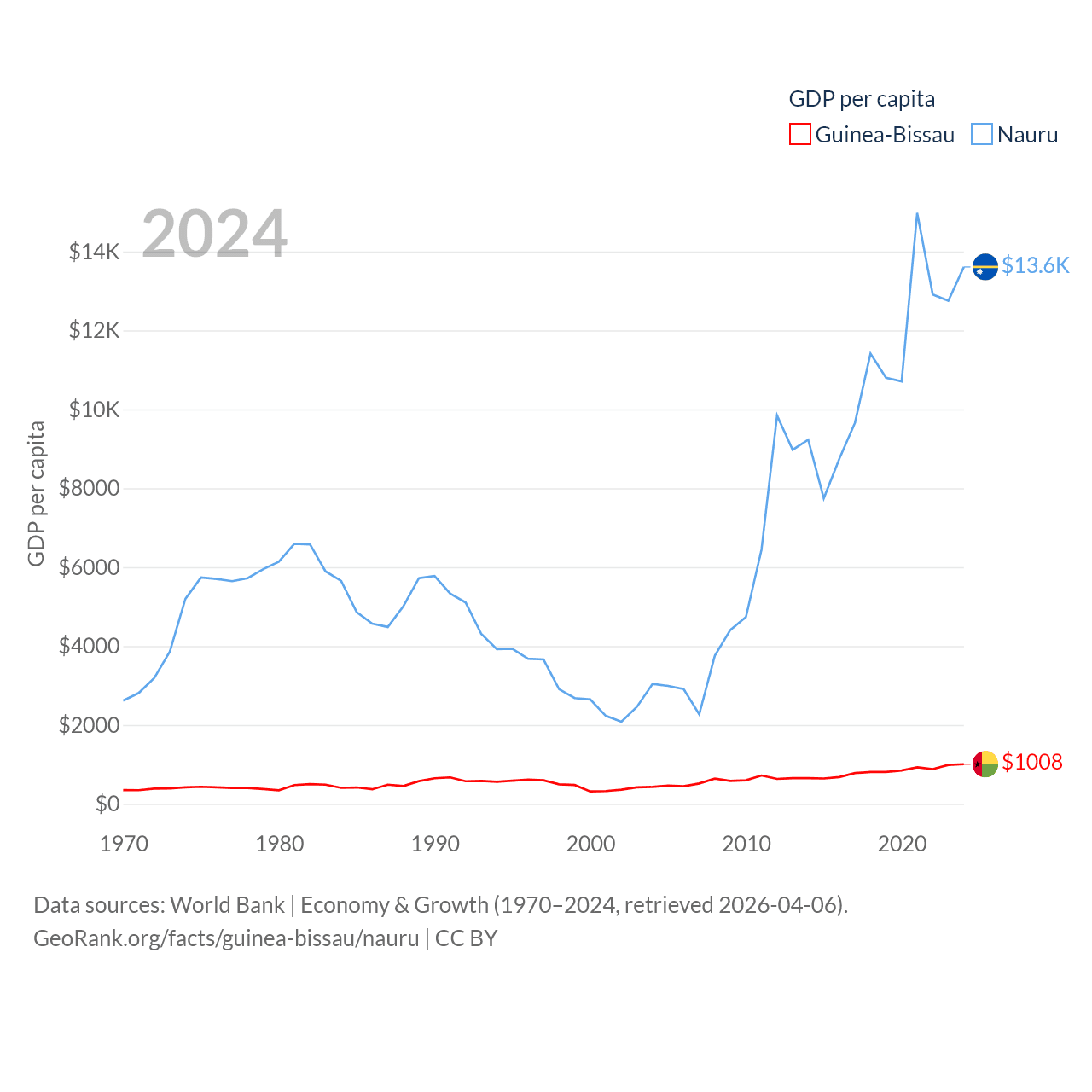By GDP, Guinea-Bissau ranks 176/197 ($2.22B) and Nauru ranks 195/197 ($163M). By GDP per capita, Guinea-Bissau ranks 177/197 ($1,008), while Nauru ranks 74/197 ($13,609).