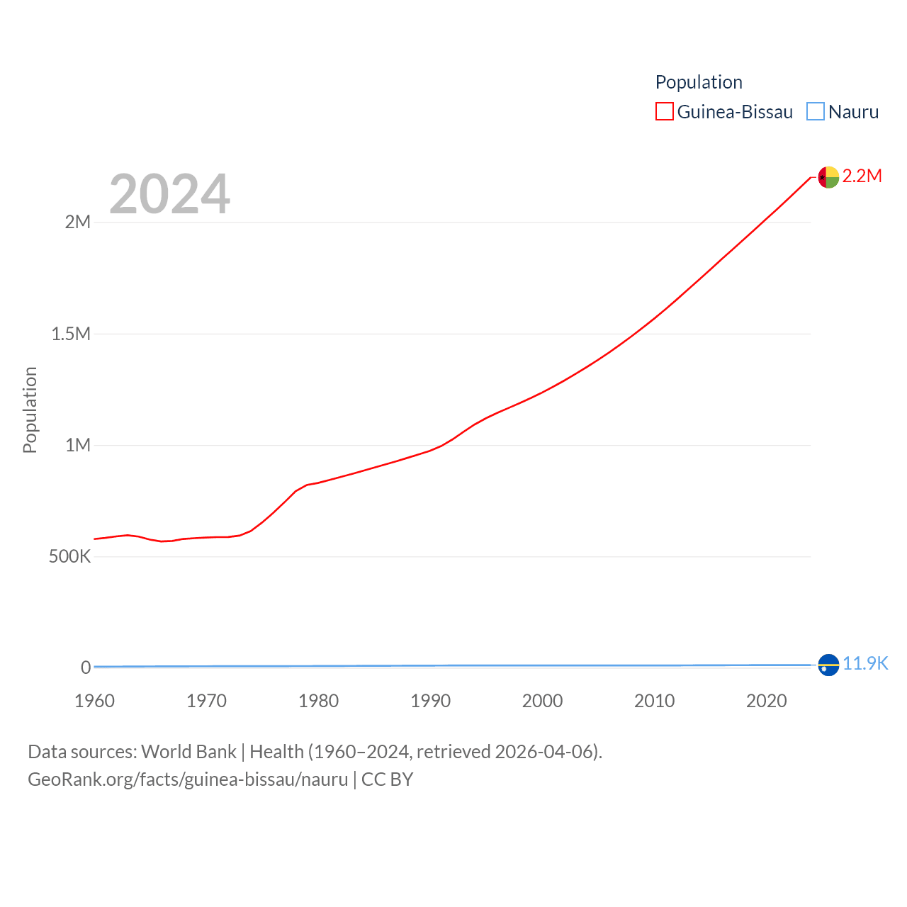 Guinea-Bissau has a population of 2.2M (ranked 146/197), compared with 11.9K in Nauru (ranked 195/197). Guinea-Bissau's land area is 10,857 sq mi versus 7.72 sq mi for Nauru (ranked 139th vs. 195th).
