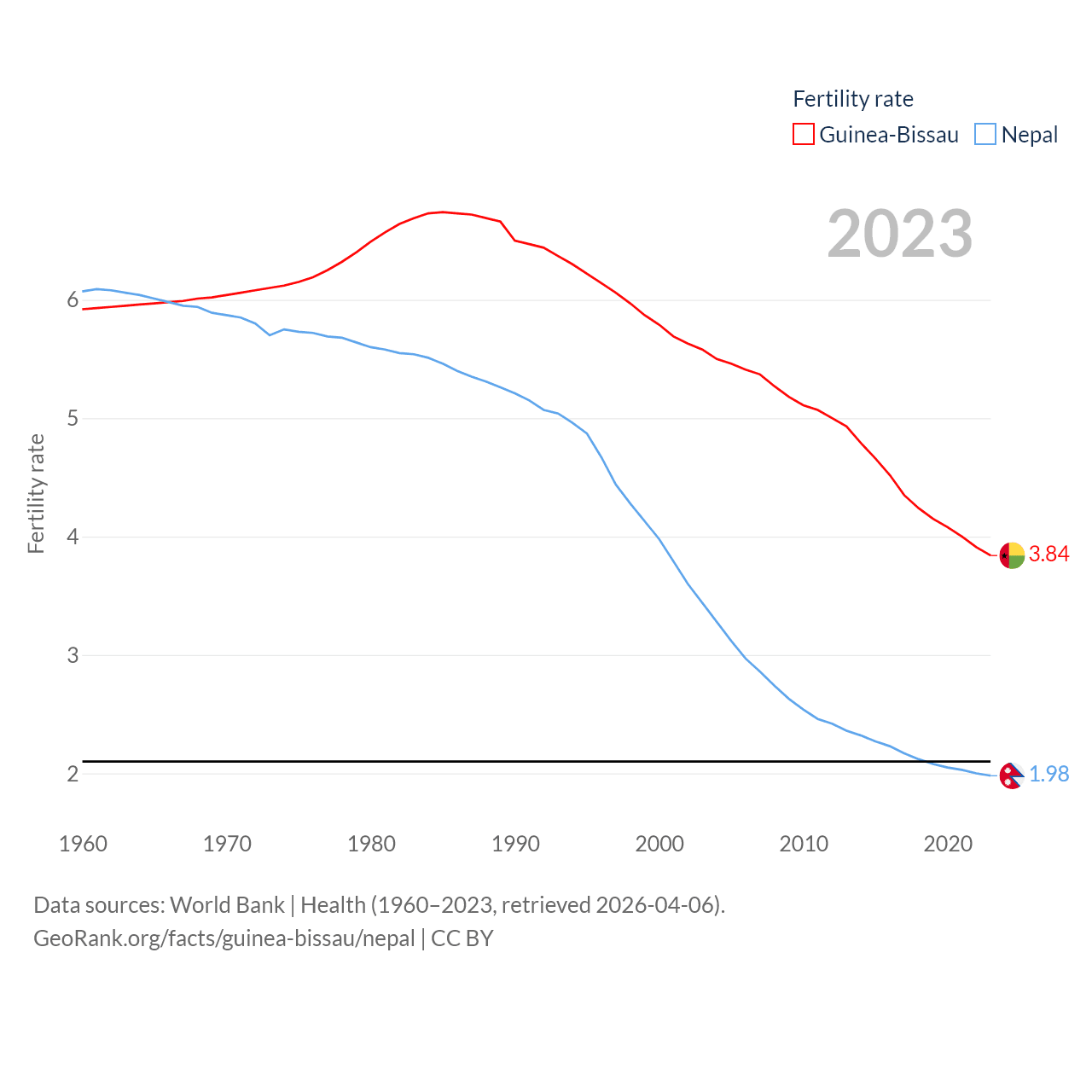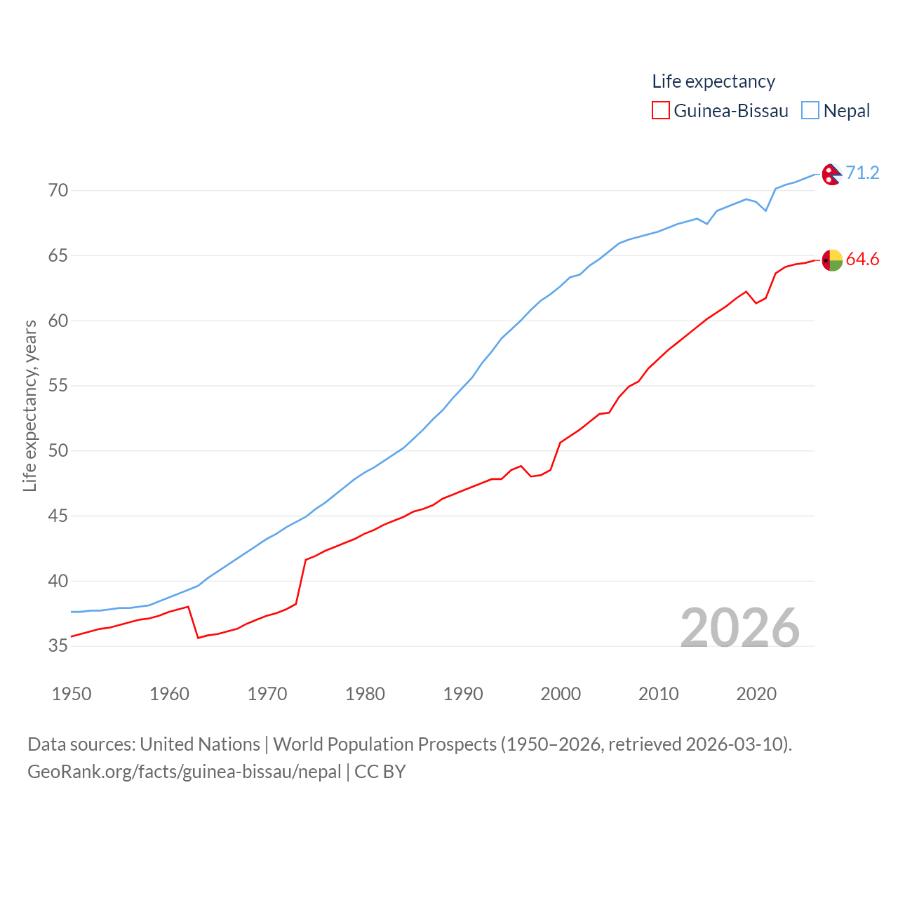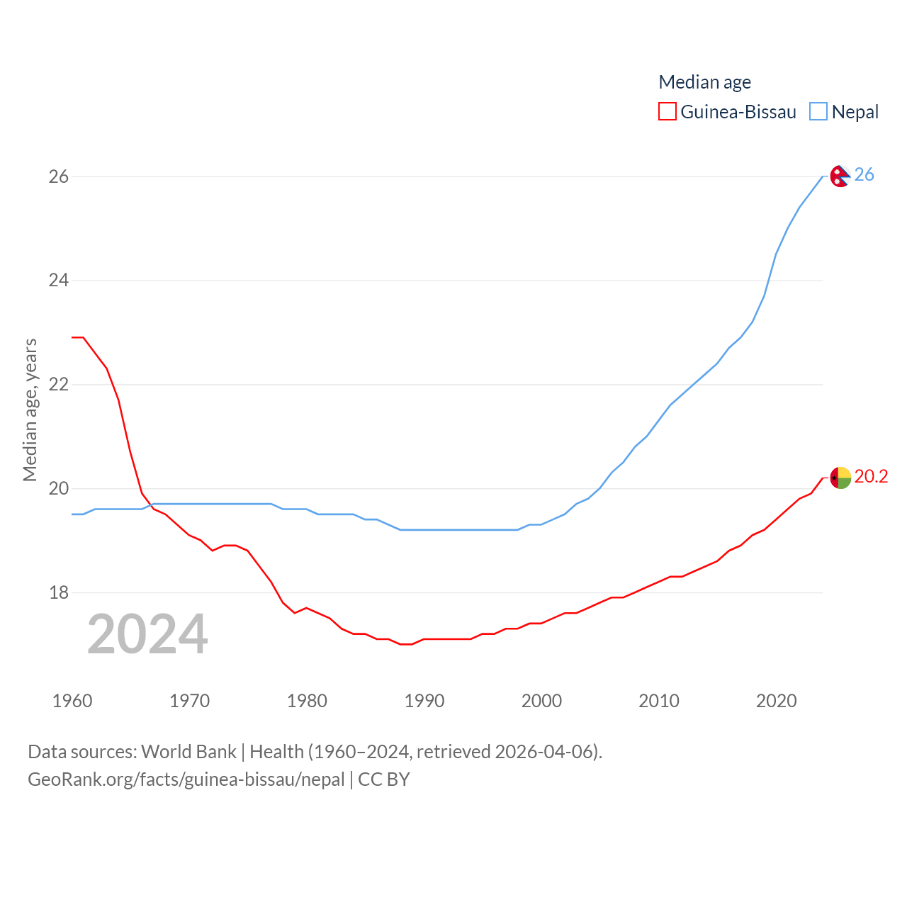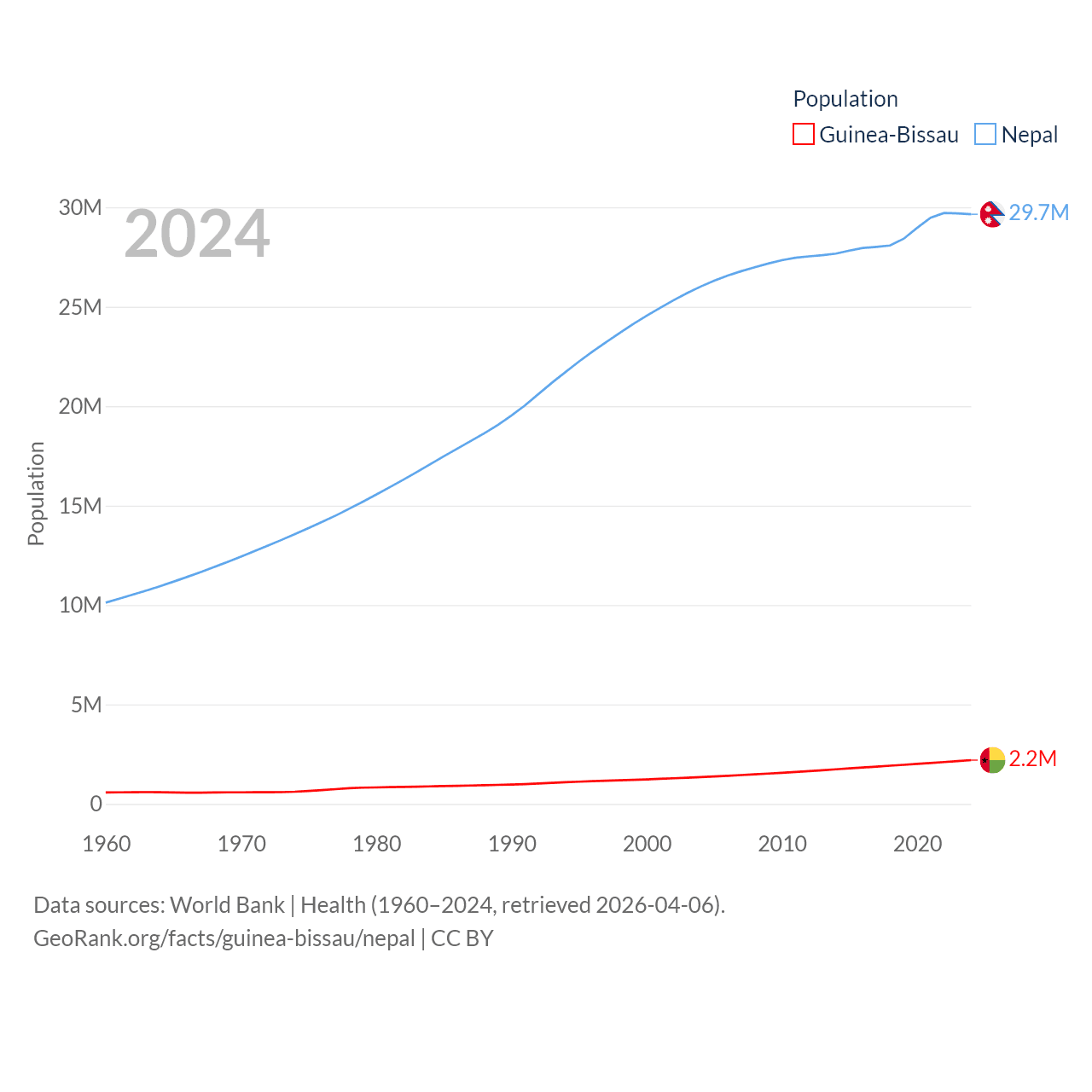Guinea-Bissau has a population of 2.2M (ranked 146/197), compared with 29.7M in Nepal (ranked 51/197). Guinea-Bissau's land area is 10,857 sq mi versus 55,348 sq mi for Nepal (ranked 139th vs. 92nd).