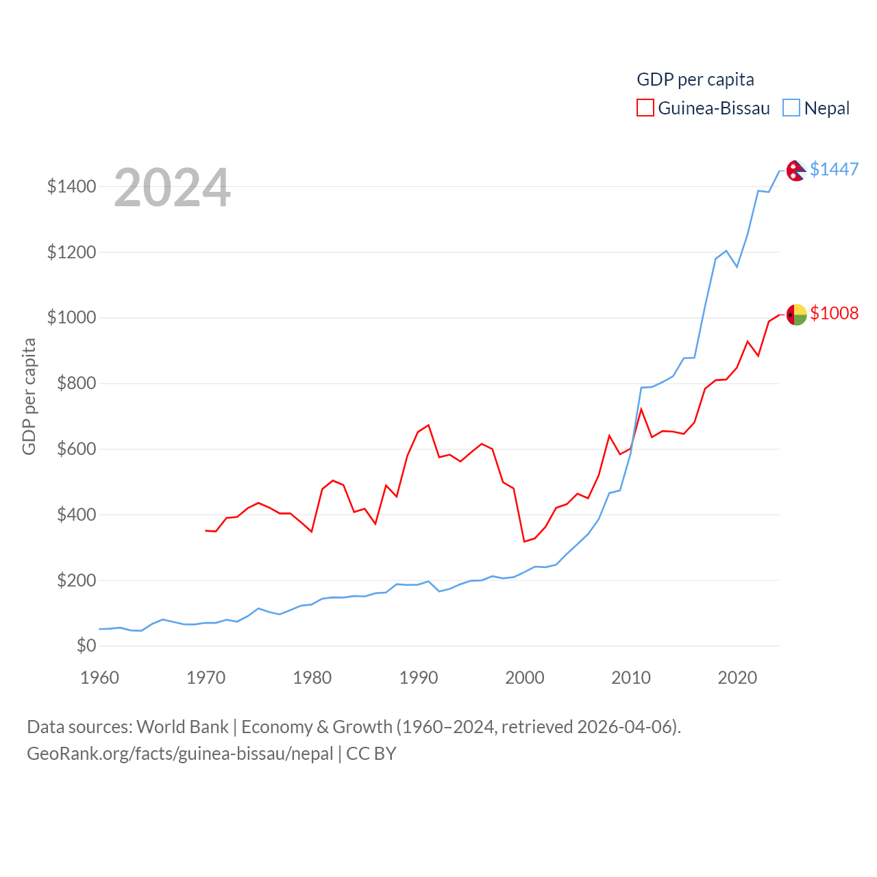 By GDP, Guinea-Bissau ranks 176/197 ($2.22B) and Nepal ranks 101/197 ($42.9B). By GDP per capita, Guinea-Bissau ranks 177/197 ($1,008), while Nepal ranks 164/197 ($1,447).