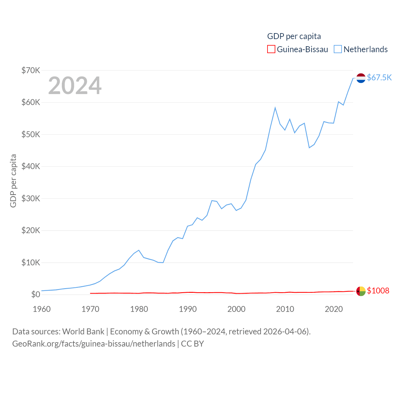 By GDP, Guinea-Bissau ranks 176/197 ($2.22B) and The Netherlands ranks 19/197 ($1.21T). By GDP per capita, Guinea-Bissau ranks 177/197 ($1,008), while The Netherlands ranks 13/197 ($67,520).