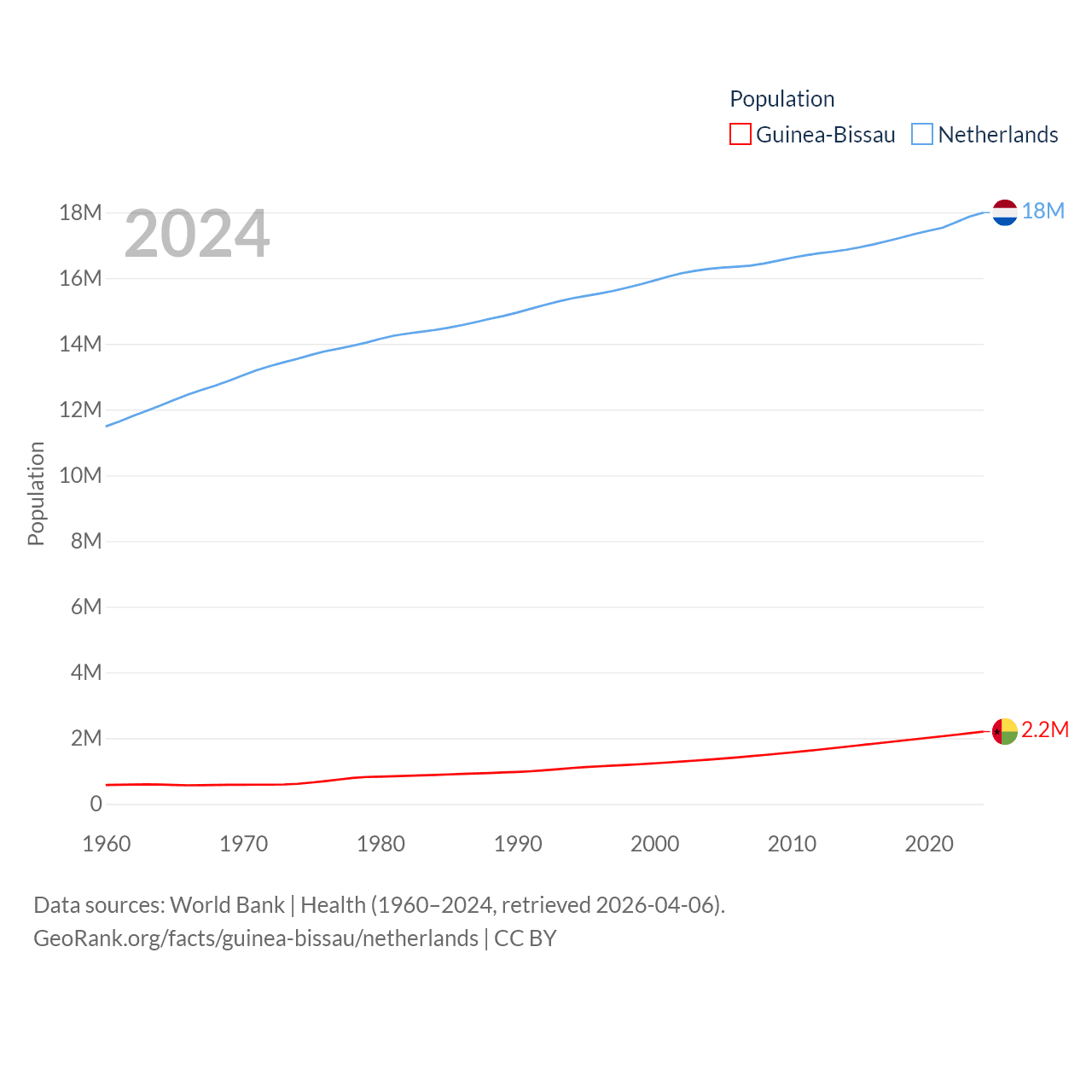 Guinea-Bissau has a population of 2.2M (ranked 146/197), compared with 18M in The Netherlands (ranked 72/197). Guinea-Bissau's land area is 10,857 sq mi versus 13,000 sq mi for The Netherlands (ranked 139th vs. 134th).