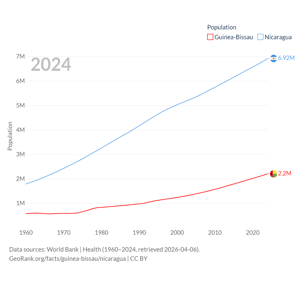Guinea-Bissau has a population of 2.2M (ranked 146/197), compared with 6.92M in Nicaragua (ranked 108/197). Guinea-Bissau's land area is 10,857 sq mi versus 46,464 sq mi for Nicaragua (ranked 139th vs. 98th).