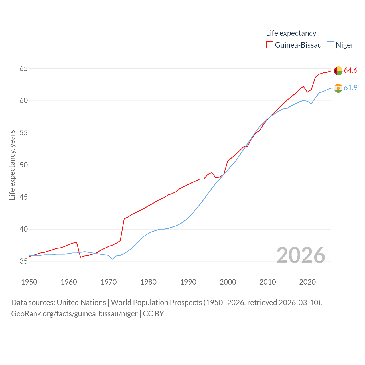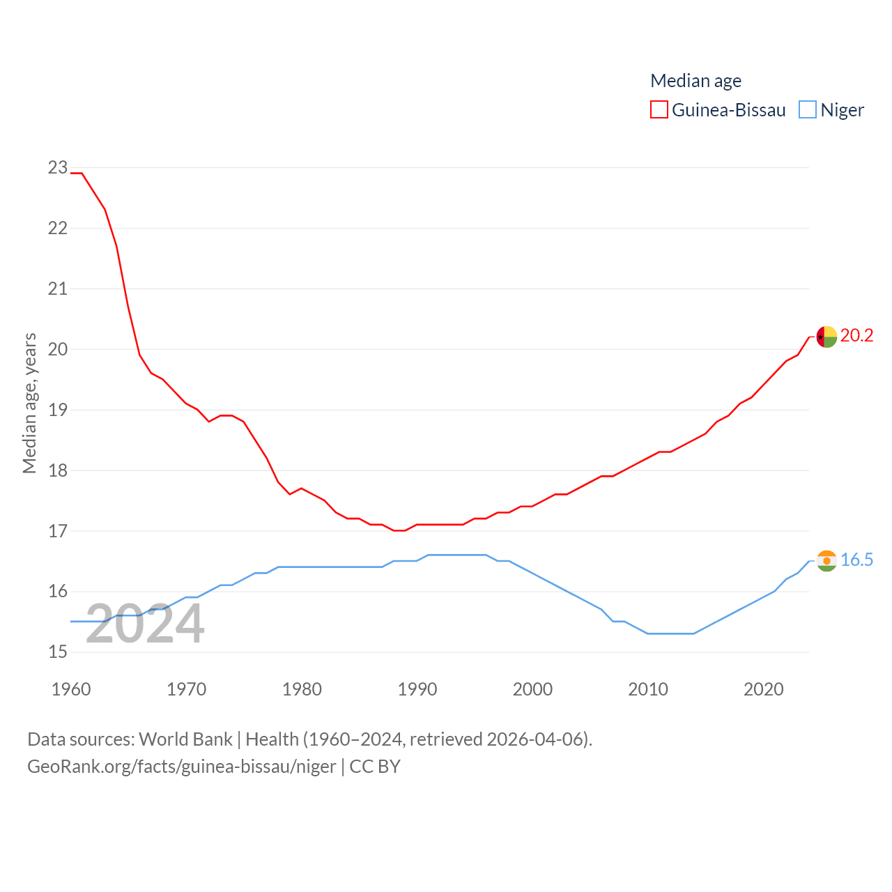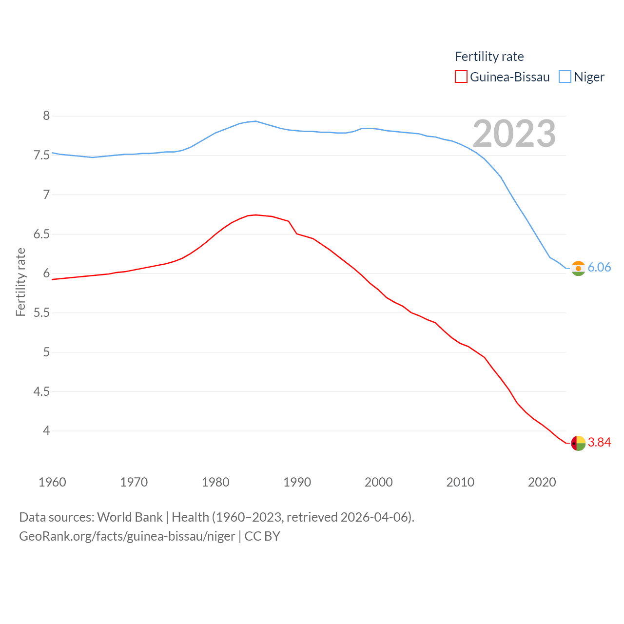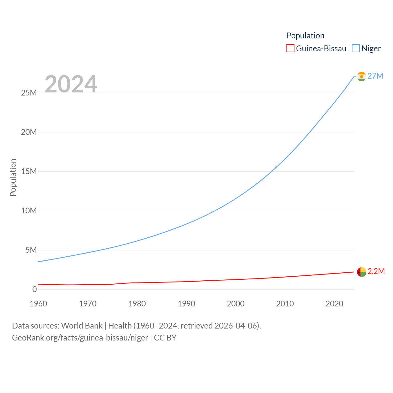 Guinea-Bissau has a population of 2.2M (ranked 146/197), compared with 27M in Niger (ranked 55/197). Guinea-Bissau's land area is 10,857 sq mi versus 489,076 sq mi for Niger (ranked 139th vs. 20th).