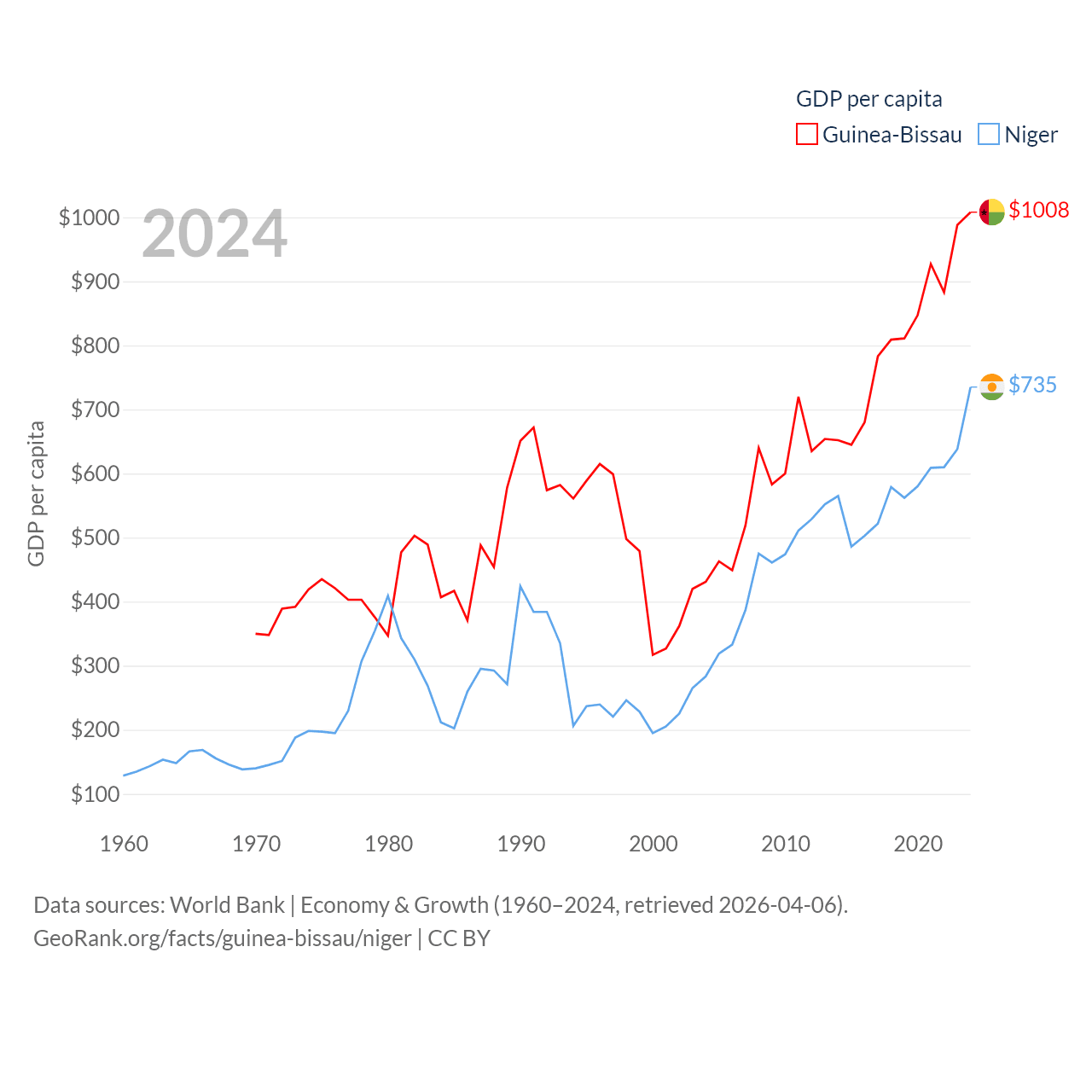 By GDP, Guinea-Bissau ranks 176/197 ($2.22B) and Niger ranks 130/197 ($19.9B). By GDP per capita, Guinea-Bissau ranks 177/197 ($1,008), while Niger ranks 187/197 ($735).