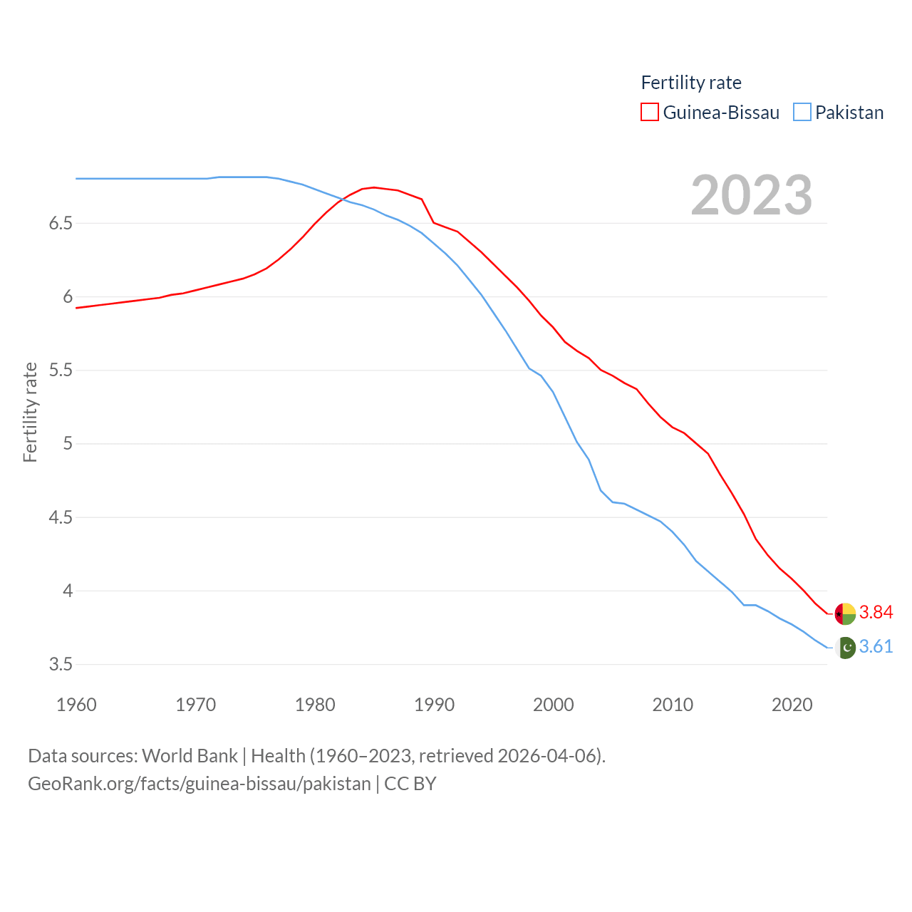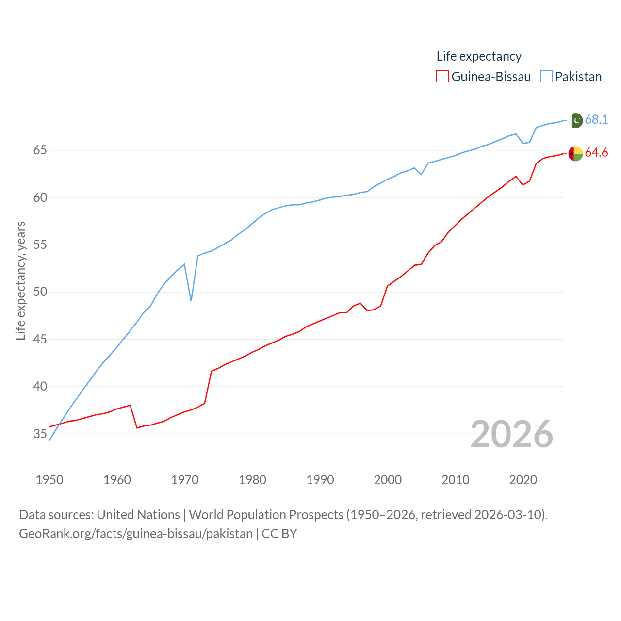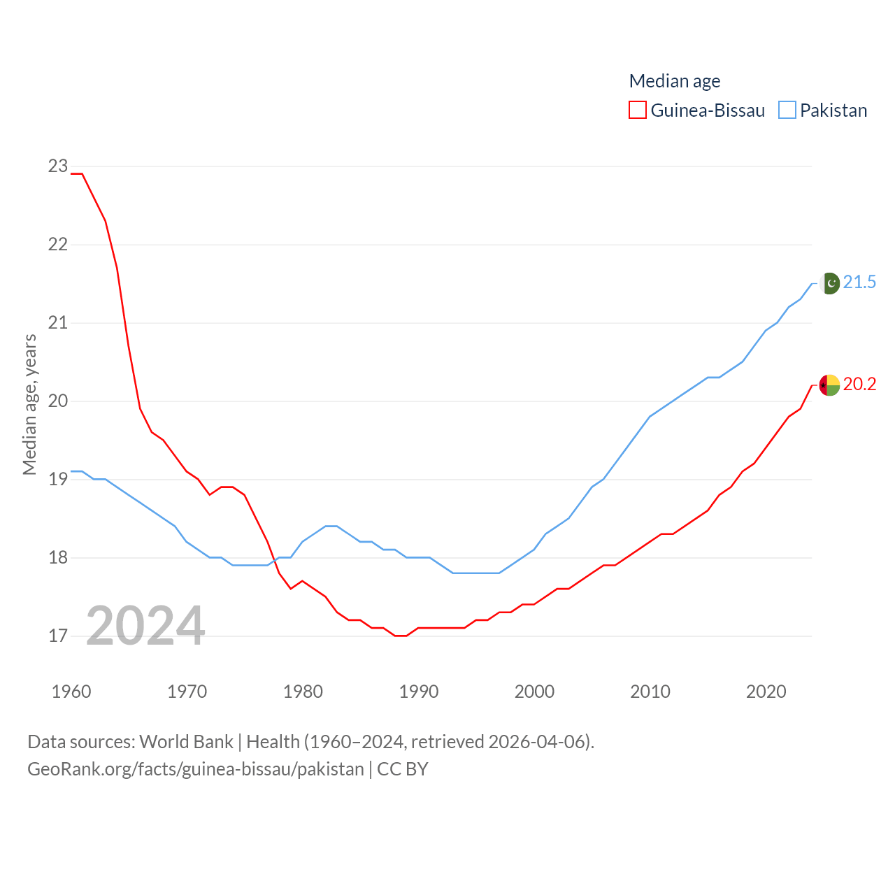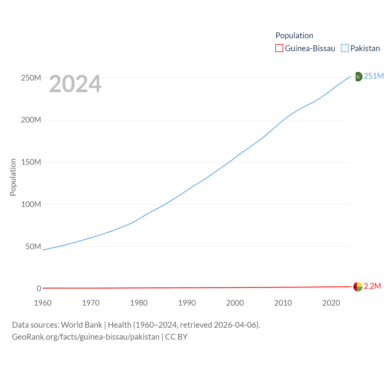 Guinea-Bissau has a population of 2.2M (ranked 146/197), compared with 251M in Pakistan (ranked 5/197). Guinea-Bissau's land area is 10,857 sq mi versus 297,638 sq mi for Pakistan (ranked 139th vs. 35th).