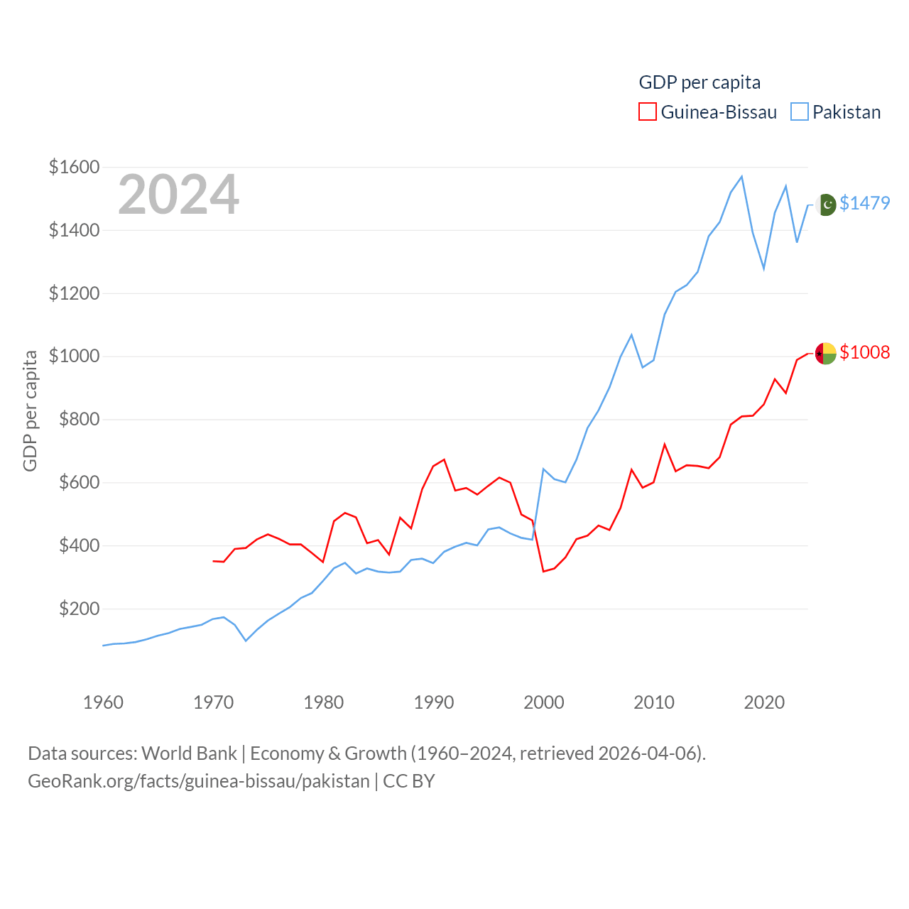 By GDP, Guinea-Bissau ranks 176/197 ($2.22B) and Pakistan ranks 43/197 ($372B). By GDP per capita, Guinea-Bissau ranks 177/197 ($1,008), while Pakistan ranks 163/197 ($1,479).