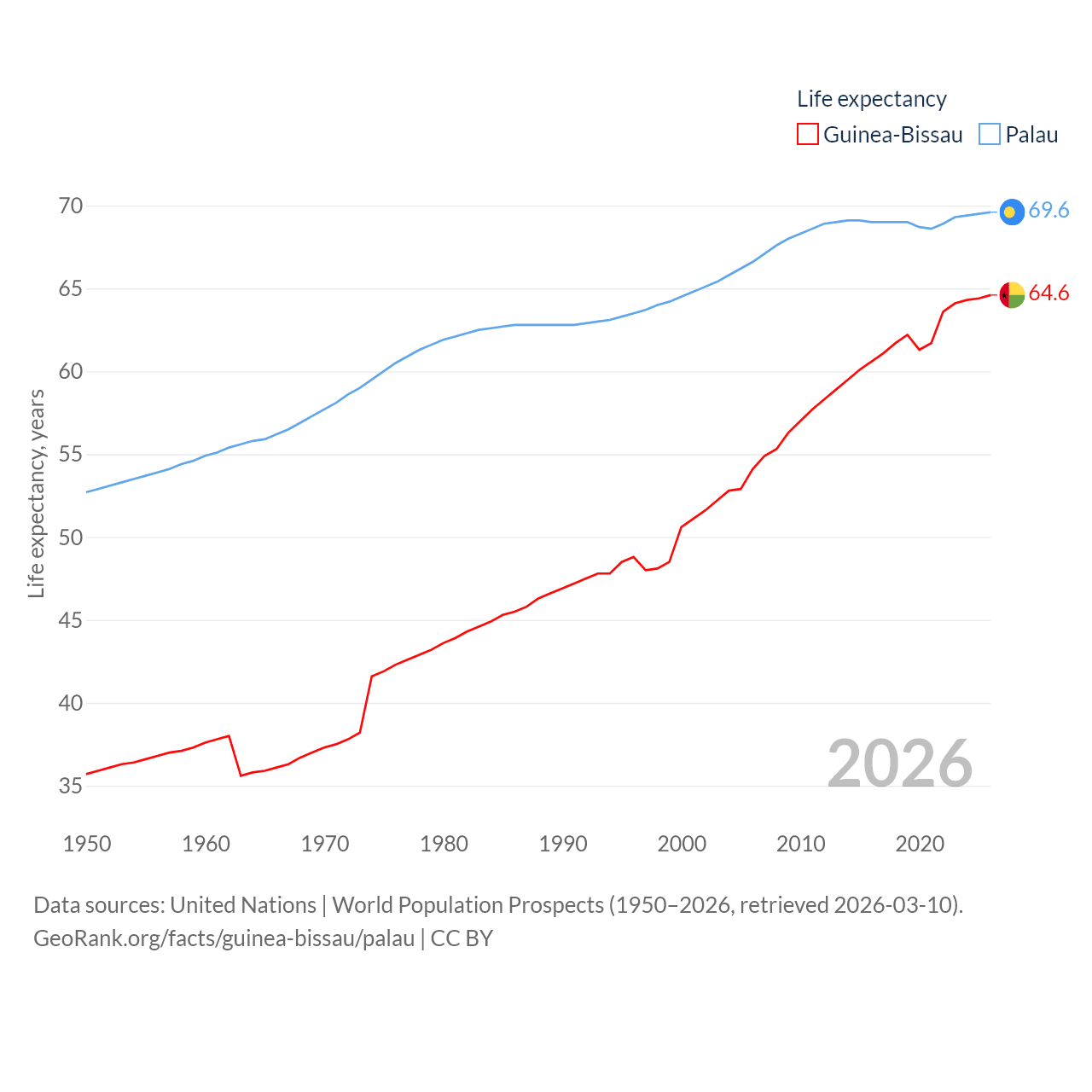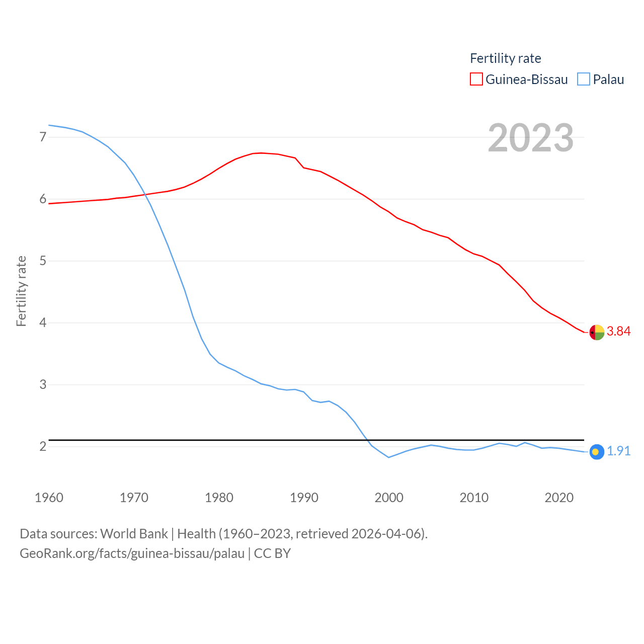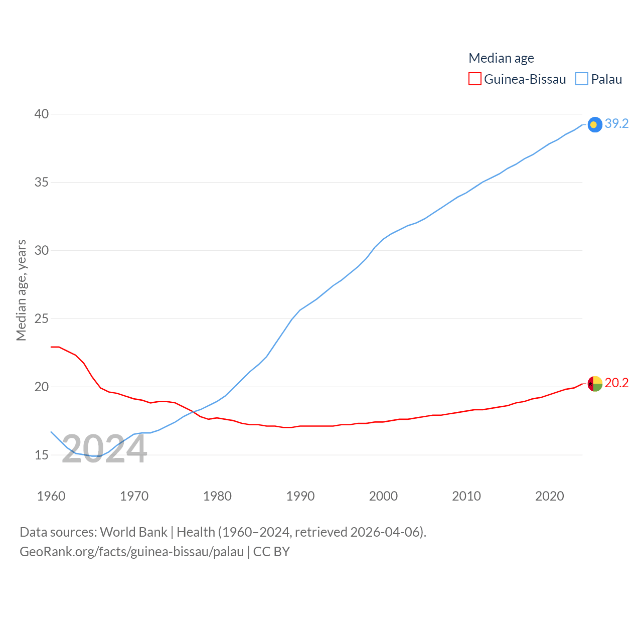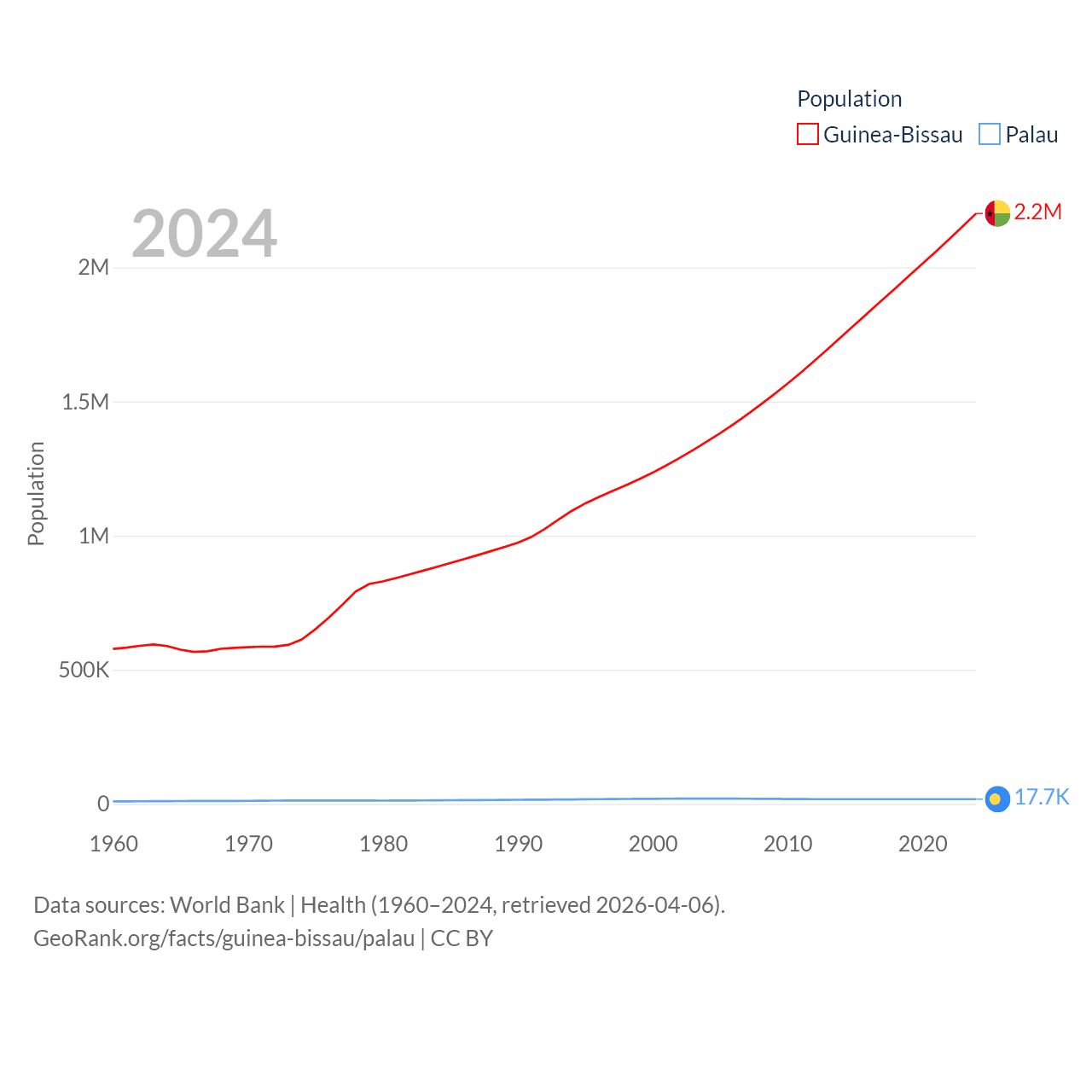 Guinea-Bissau has a population of 2.2M (ranked 146/197), compared with 17.7K in Palau (ranked 194/197). Guinea-Bissau's land area is 10,857 sq mi versus 177.6 sq mi for Palau (ranked 139th vs. 180th).