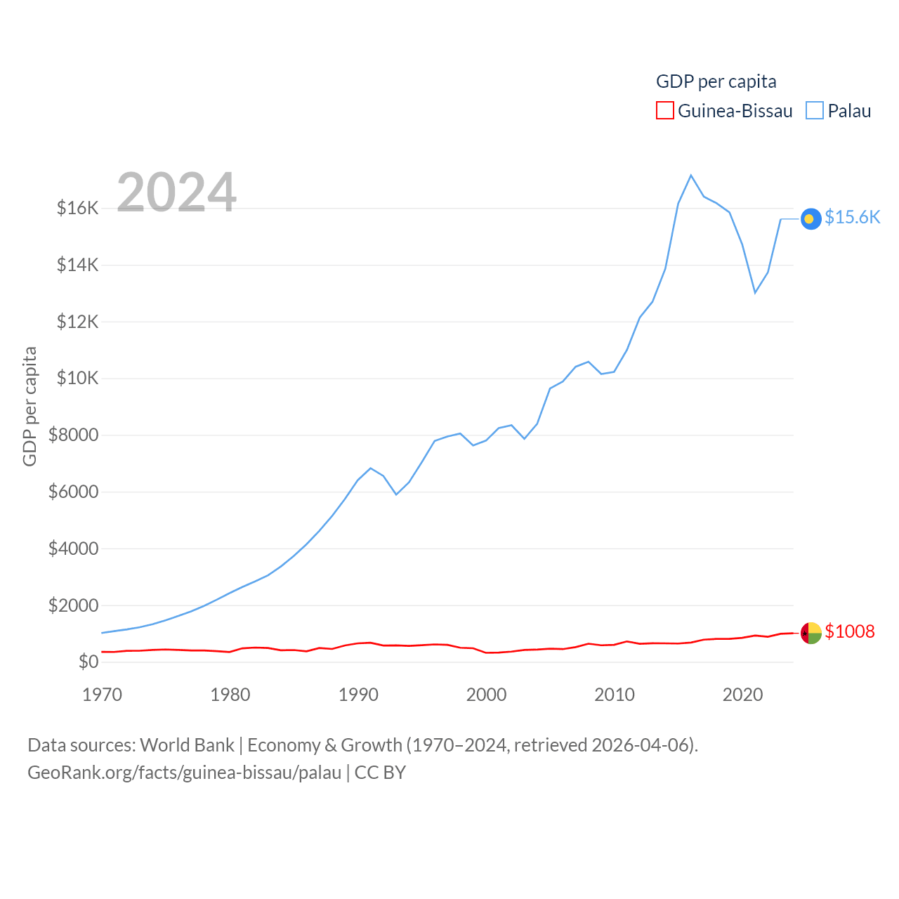 By GDP, Guinea-Bissau ranks 176/197 ($2.22B) and Palau ranks 194/197 ($277M). By GDP per capita, Guinea-Bissau ranks 177/197 ($1,008), while Palau ranks 67/197 ($15,611).