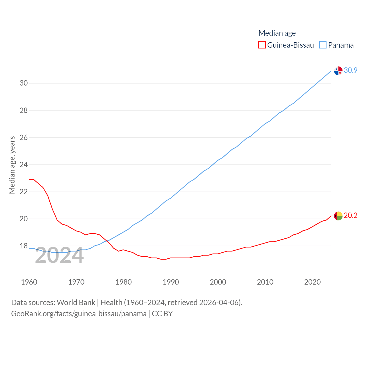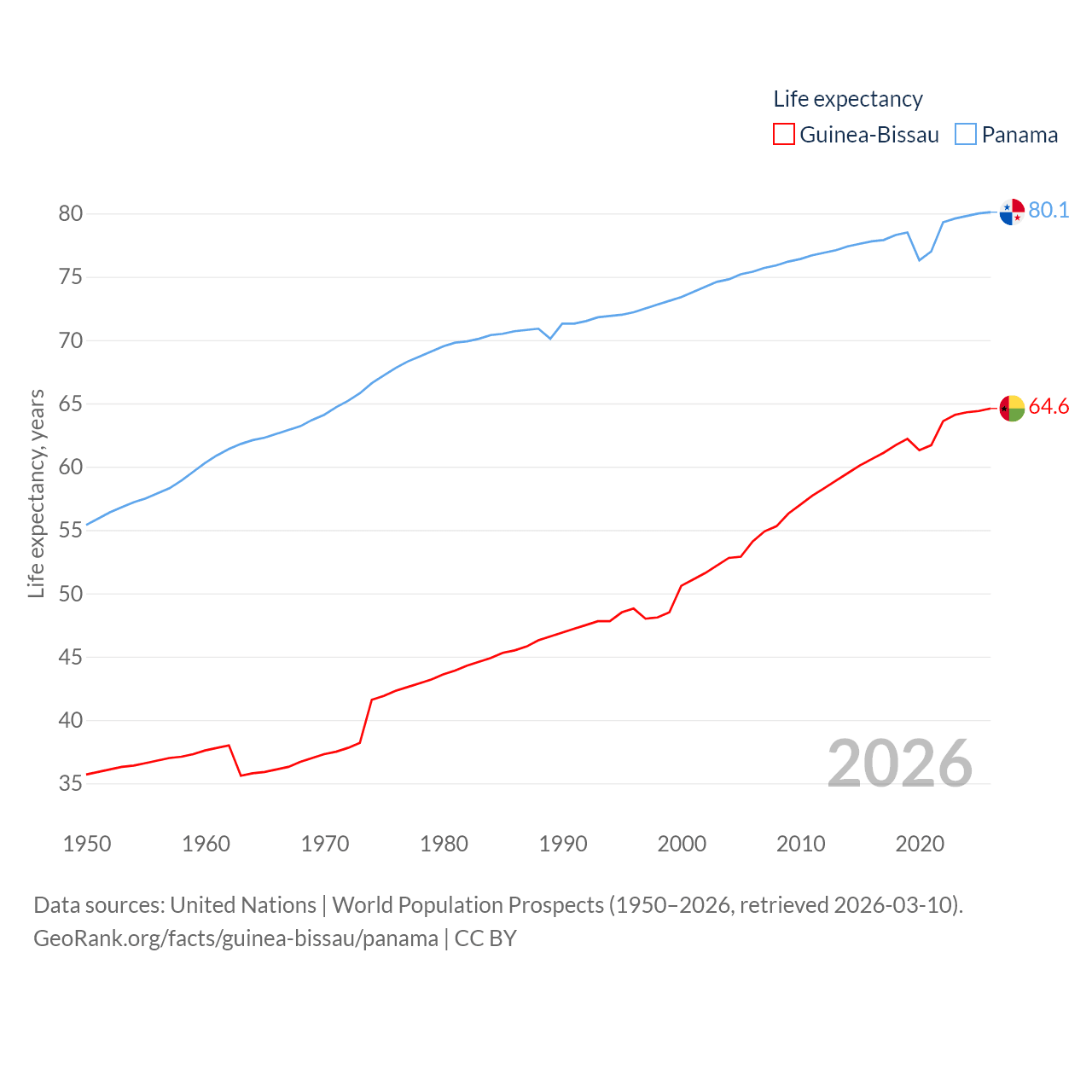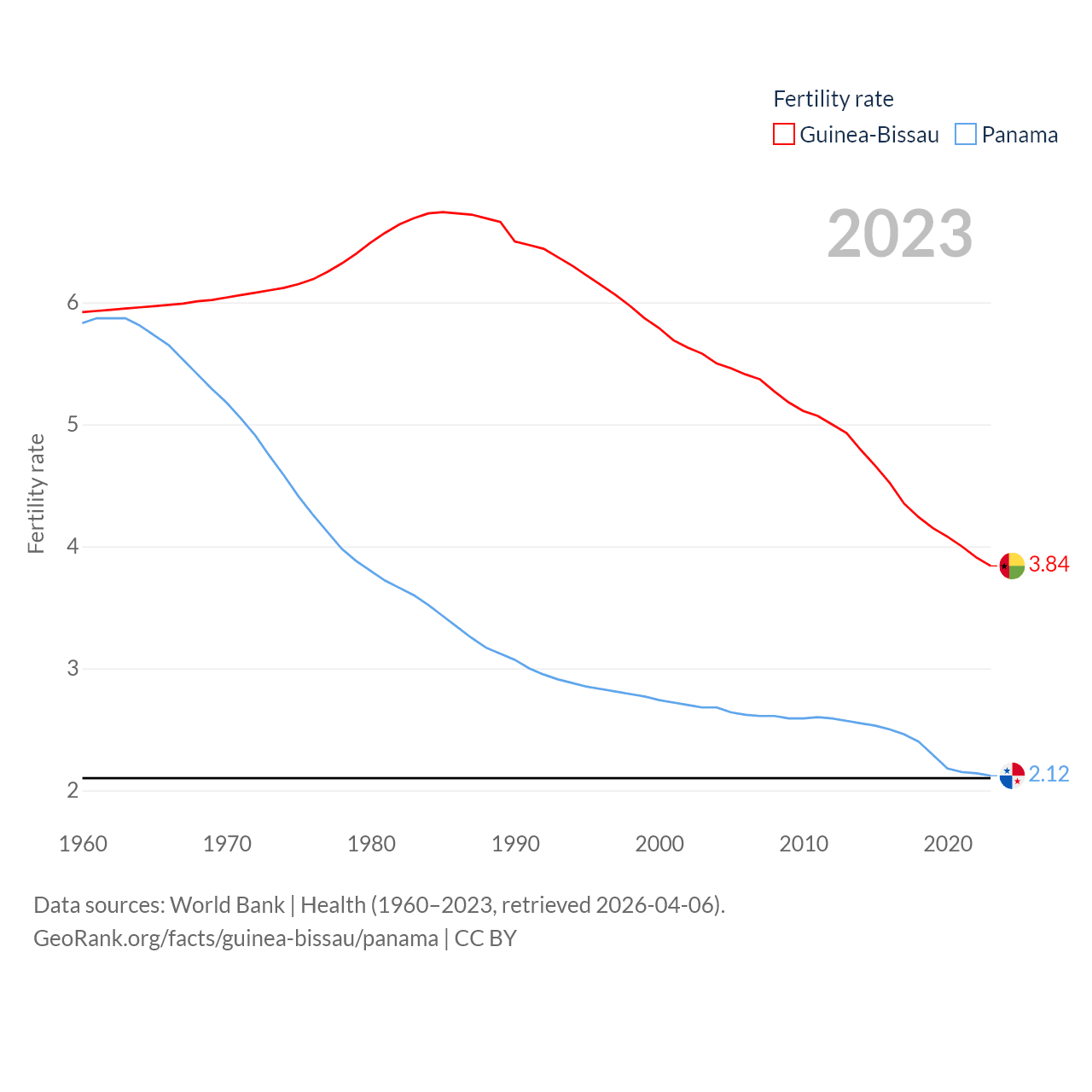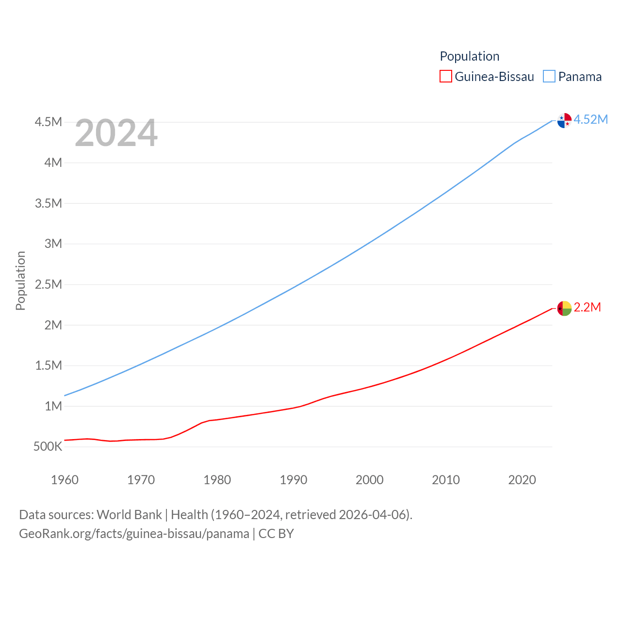 Guinea-Bissau has a population of 2.2M (ranked 146/197), compared with 4.52M in Panama (ranked 128/197). Guinea-Bissau's land area is 10,857 sq mi versus 28,641 sq mi for Panama (ranked 139th vs. 115th).