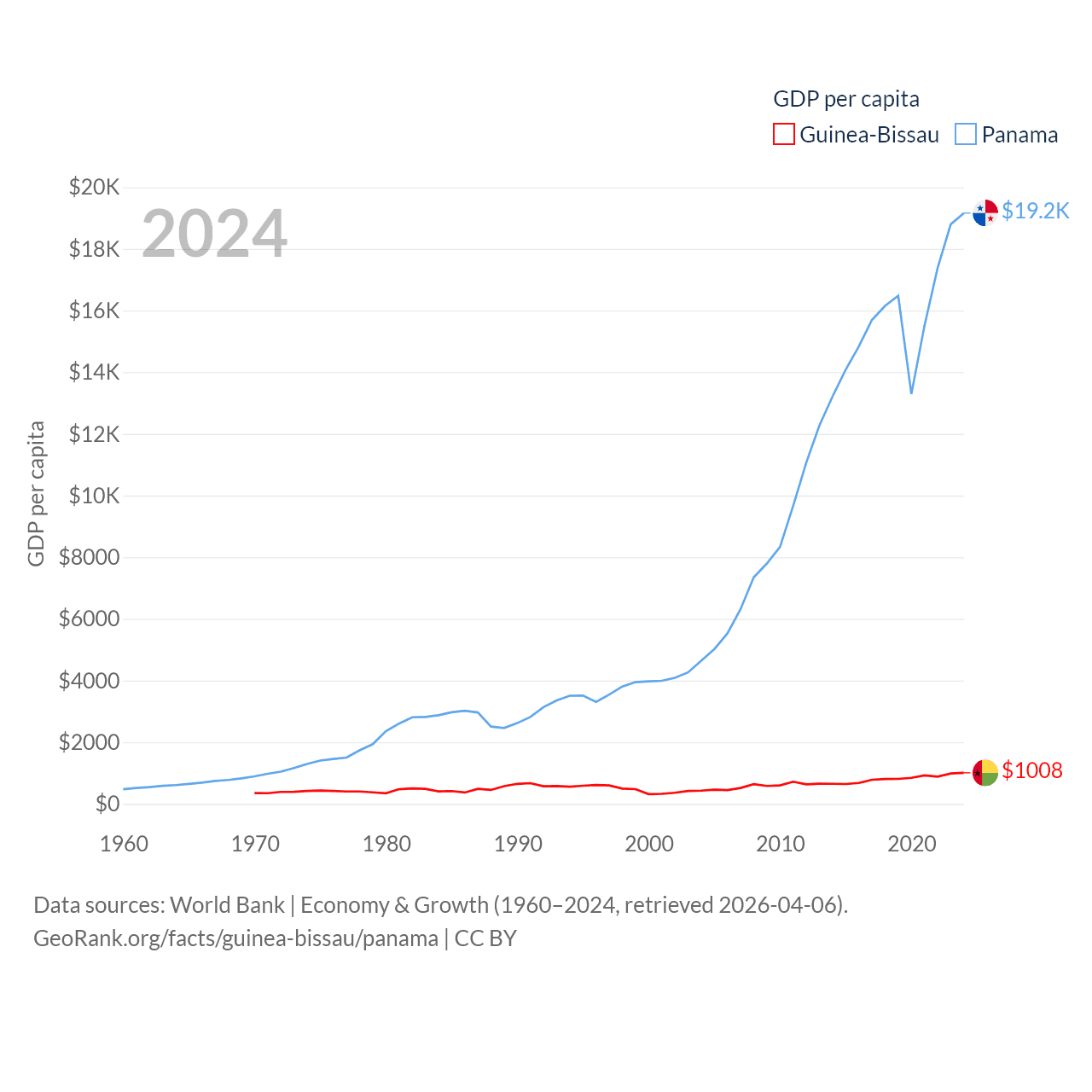 By GDP, Guinea-Bissau ranks 176/197 ($2.22B) and Panama ranks 78/197 ($86.5B). By GDP per capita, Guinea-Bissau ranks 177/197 ($1,008), while Panama ranks 60/197 ($19,161).