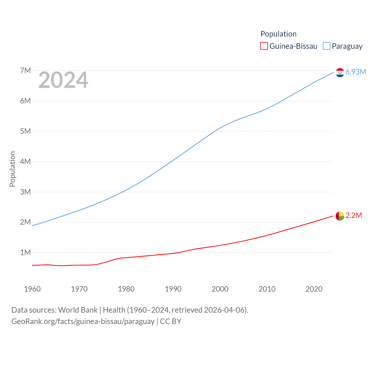 Guinea-Bissau has a population of 2.2M (ranked 146/197), compared with 6.93M in Paraguay (ranked 107/197). Guinea-Bissau's land area is 10,857 sq mi versus 152,901 sq mi for Paraguay (ranked 139th vs. 59th).