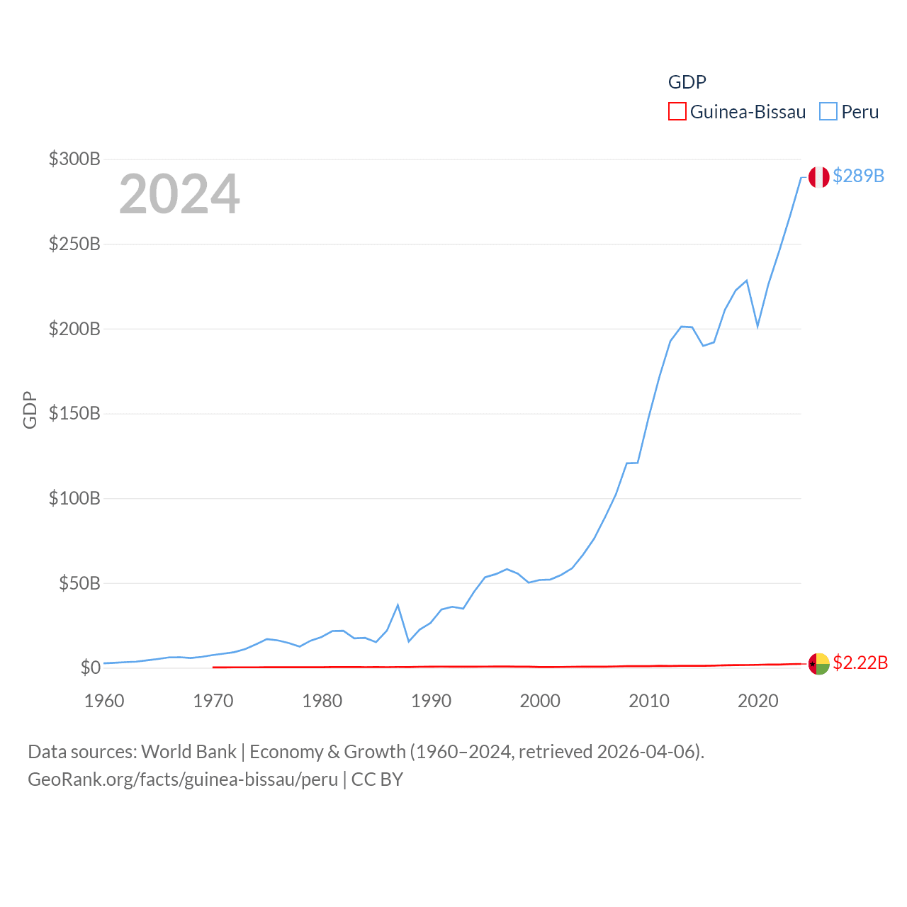 By GDP, Guinea-Bissau ranks 176/197 ($2.22B) and Peru ranks 49/197 ($289B). By GDP per capita, Guinea-Bissau ranks 177/197 ($1,008), while Peru ranks 91/197 ($8,452).