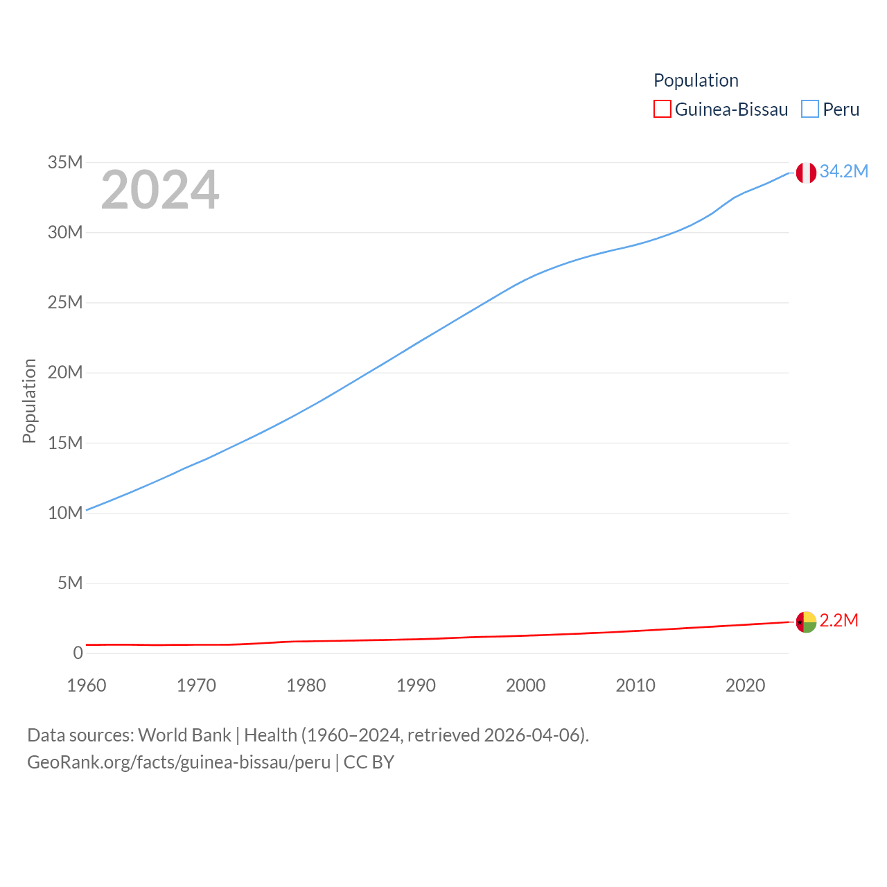 Guinea-Bissau has a population of 2.2M (ranked 146/197), compared with 34.2M in Peru (ranked 48/197). Guinea-Bissau's land area is 10,857 sq mi versus 494,211 sq mi for Peru (ranked 139th vs. 19th).