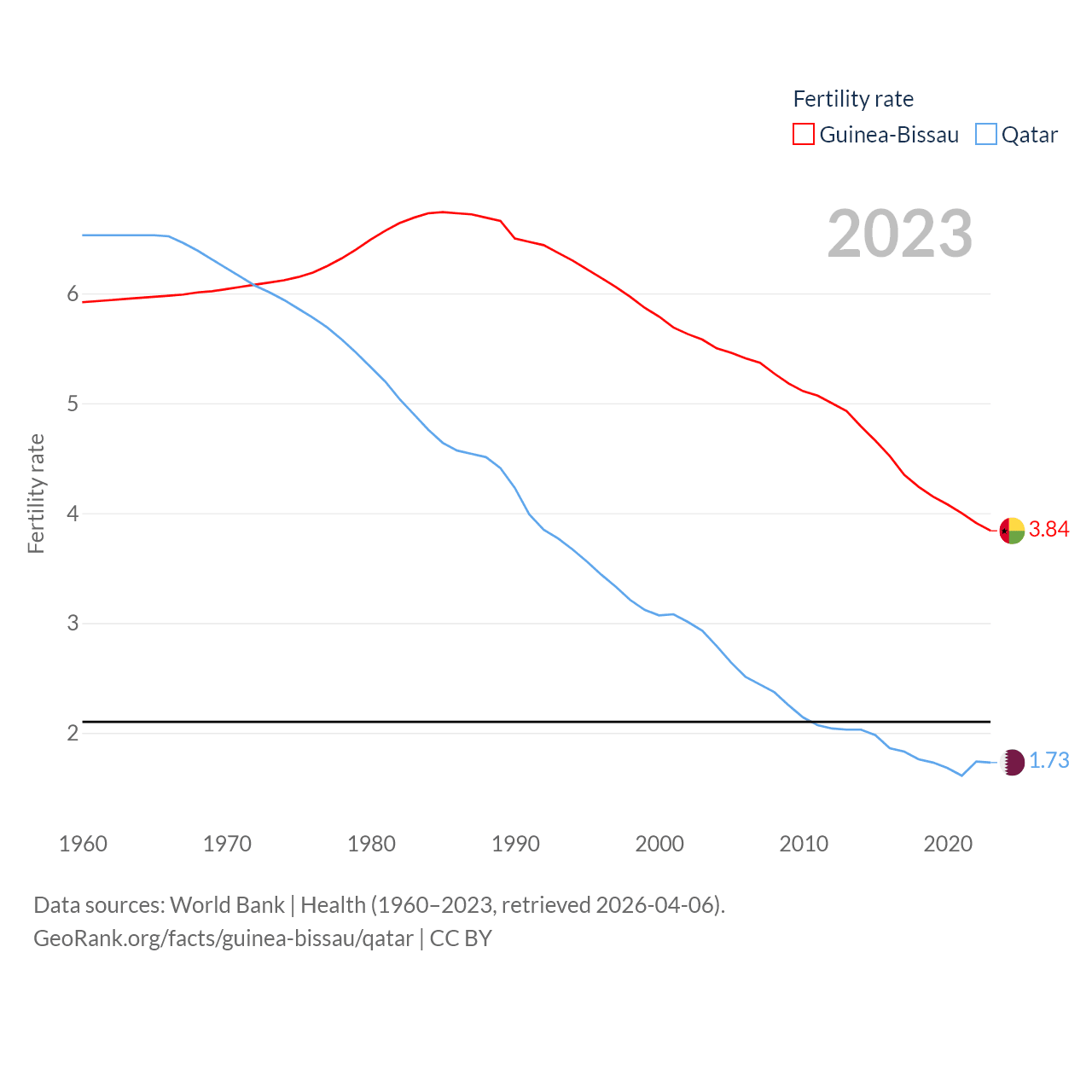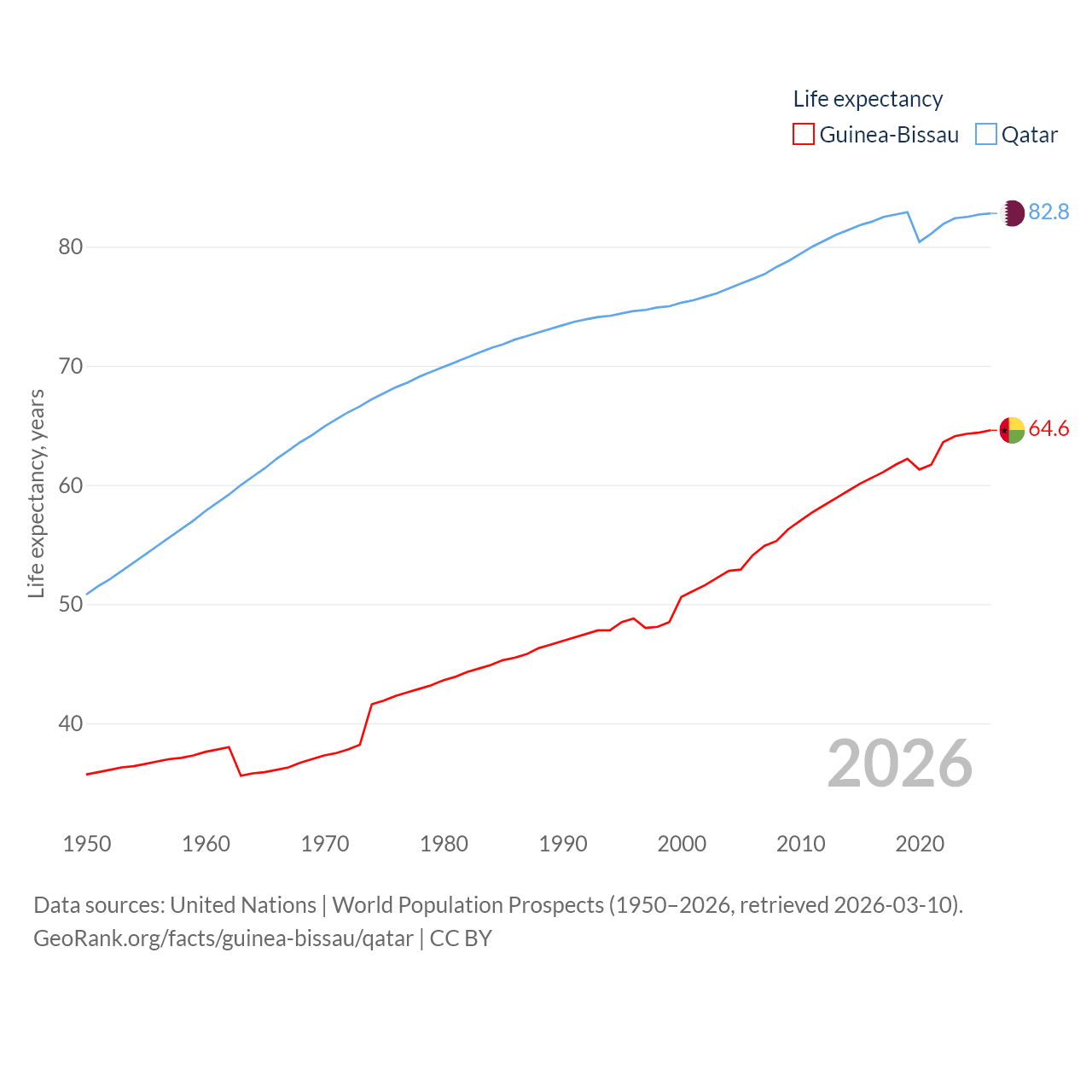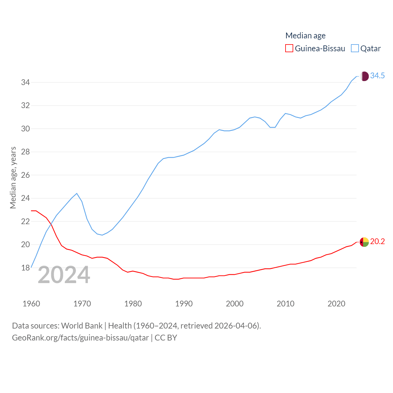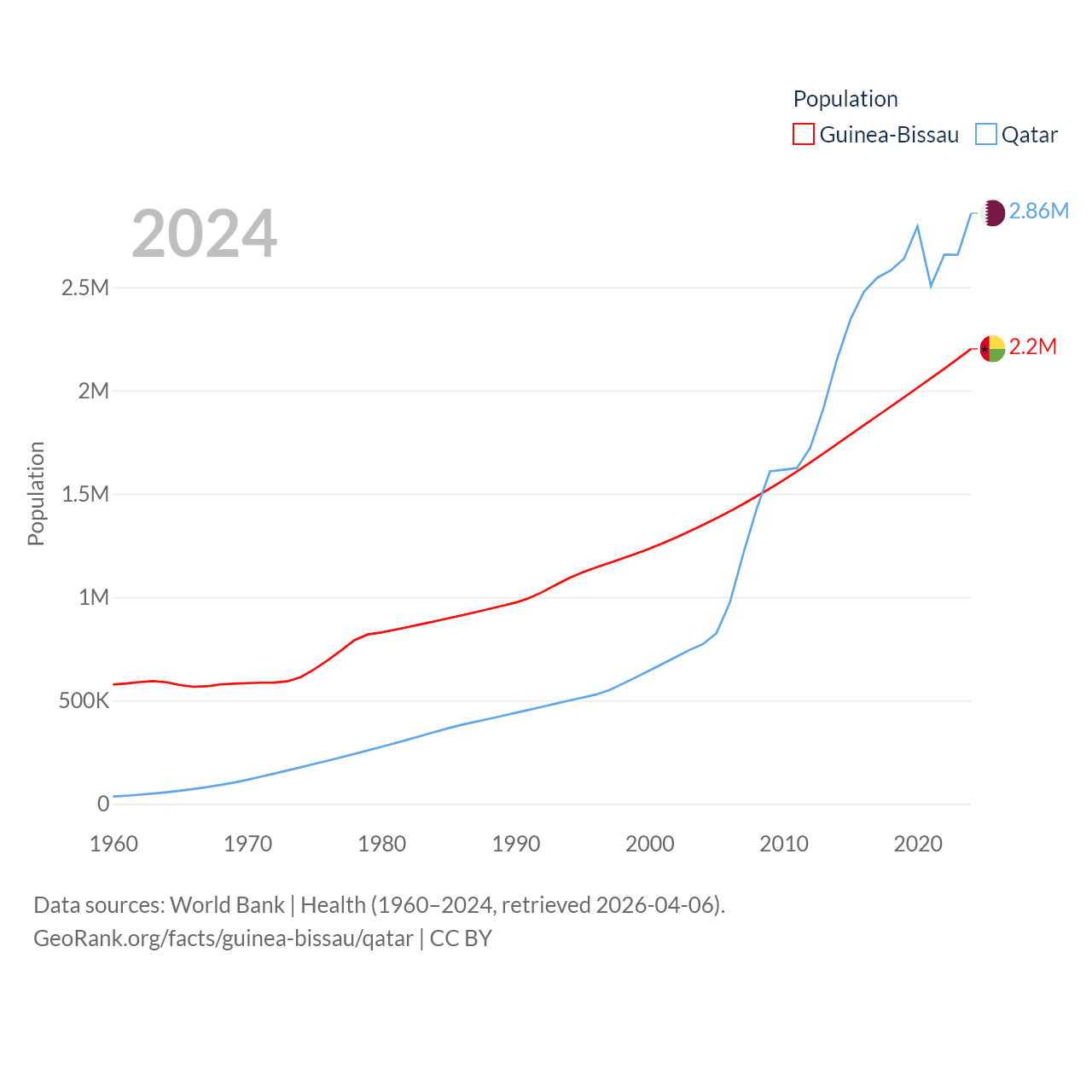 Guinea-Bissau has a population of 2.2M (ranked 146/197), compared with 2.86M in Qatar (ranked 138/197). Guinea-Bissau's land area is 10,857 sq mi versus 4,436 sq mi for Qatar (ranked 139th vs. 158th).