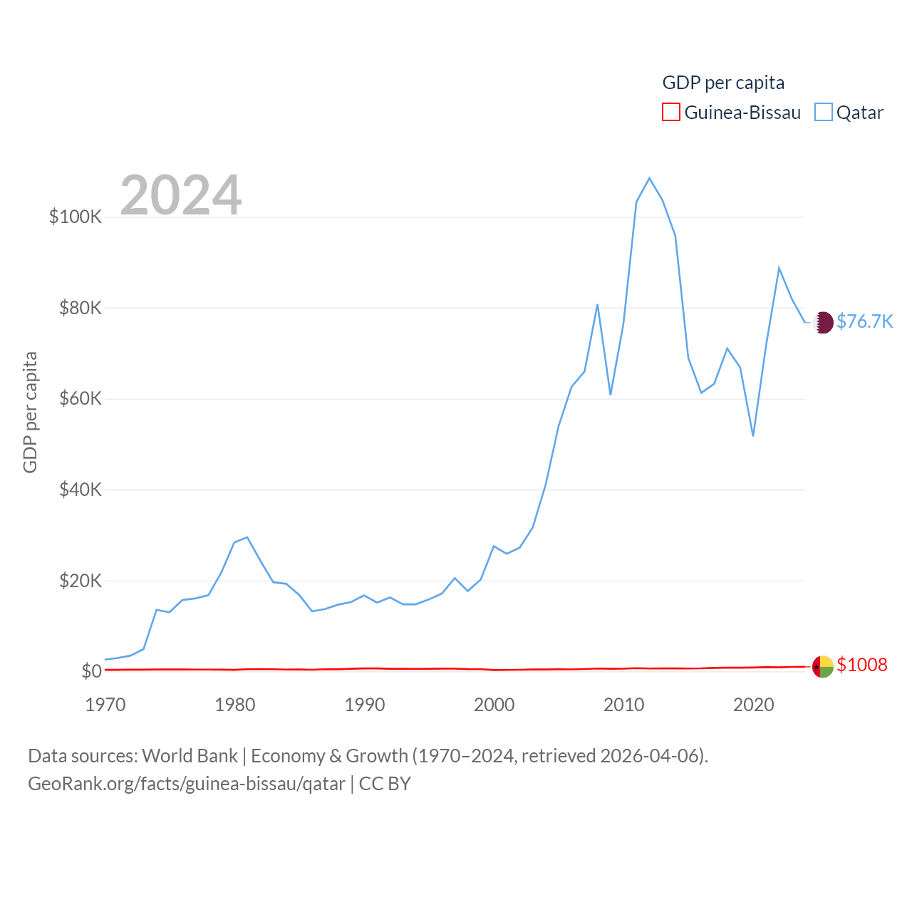 By GDP, Guinea-Bissau ranks 176/197 ($2.22B) and Qatar ranks 56/197 ($219B). By GDP per capita, Guinea-Bissau ranks 177/197 ($1,008), while Qatar ranks 11/197 ($76,689).