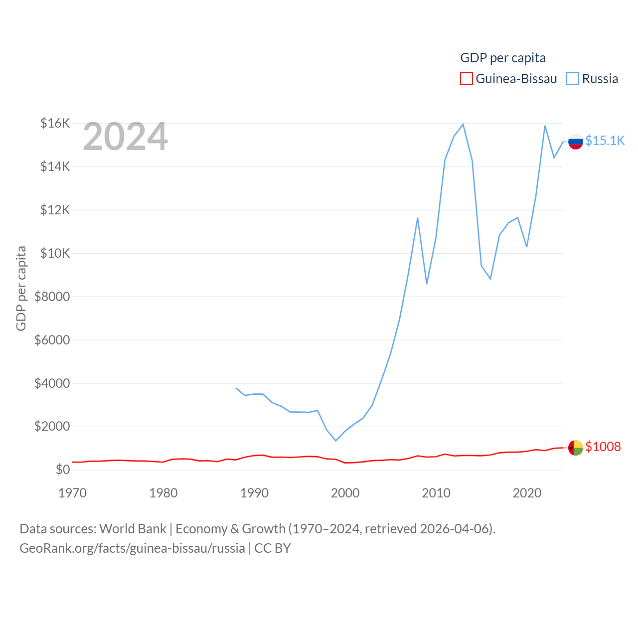 By GDP, Guinea-Bissau ranks 176/197 ($2.22B) and Russia ranks 11/197 ($2.17T). By GDP per capita, Guinea-Bissau ranks 177/197 ($1,008), while Russia ranks 68/197 ($15,145).