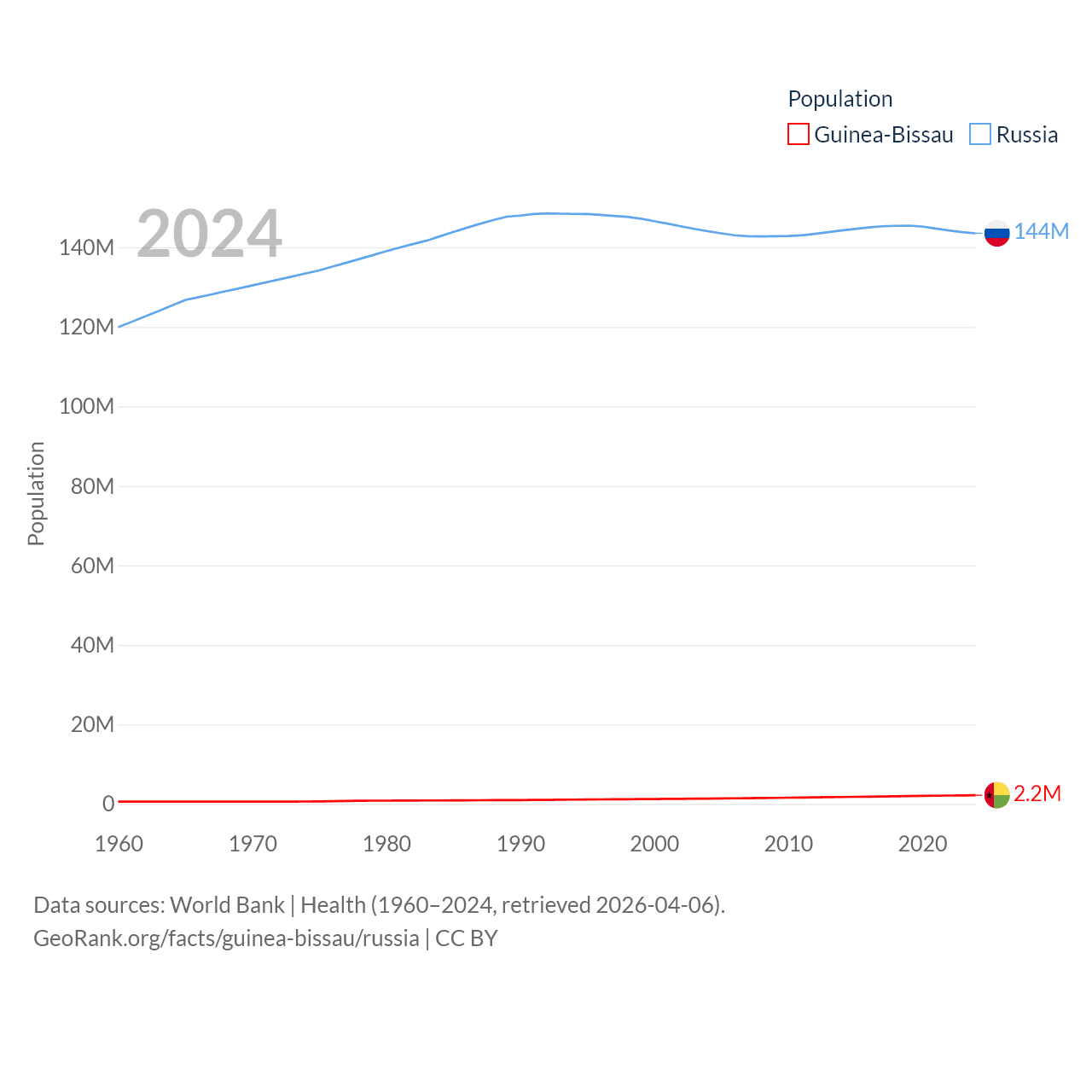 Guinea-Bissau has a population of 2.2M (ranked 146/197), compared with 144M in Russia (ranked 9/197). Guinea-Bissau's land area is 10,857 sq mi versus 6,323,145 sq mi for Russia (ranked 139th vs. 1st).