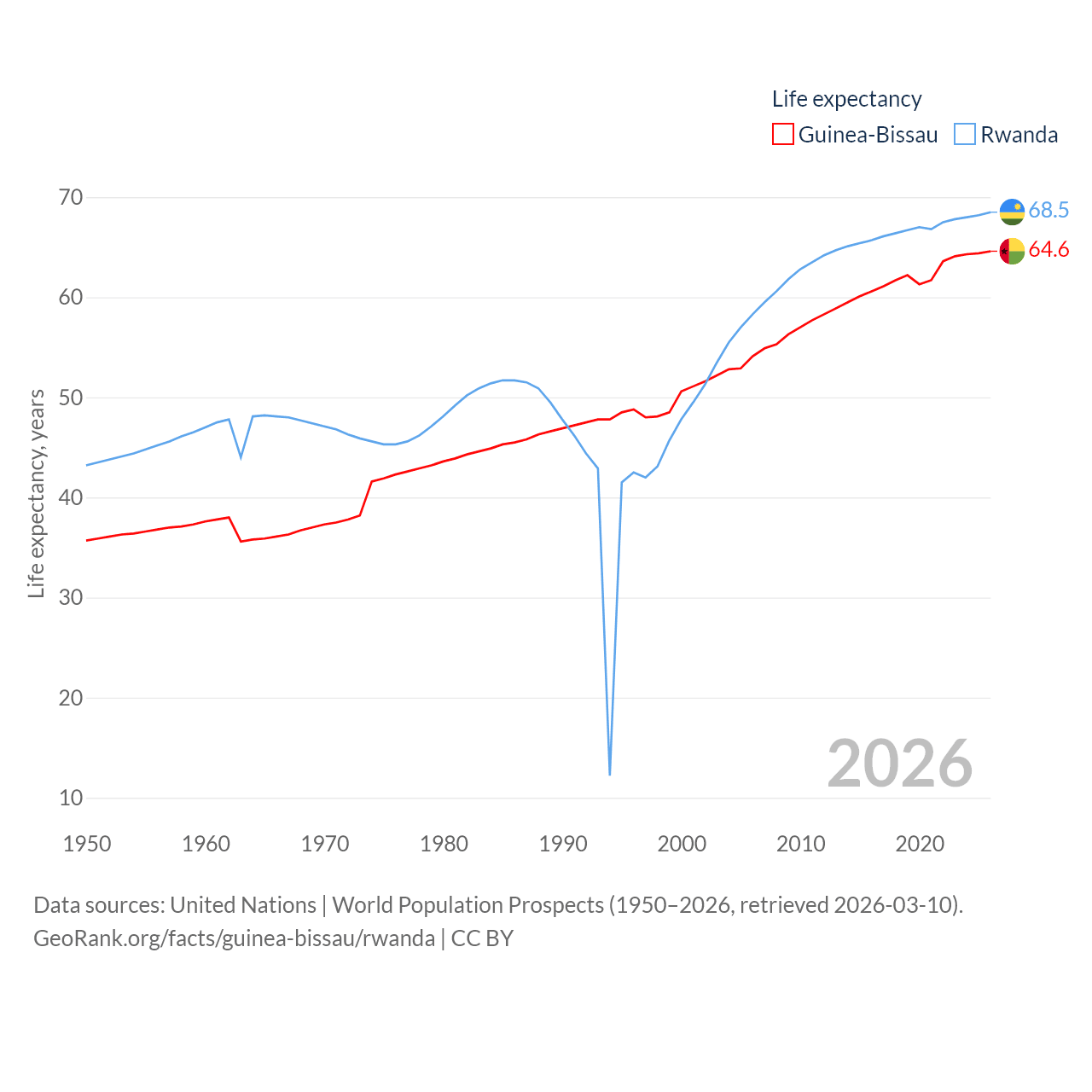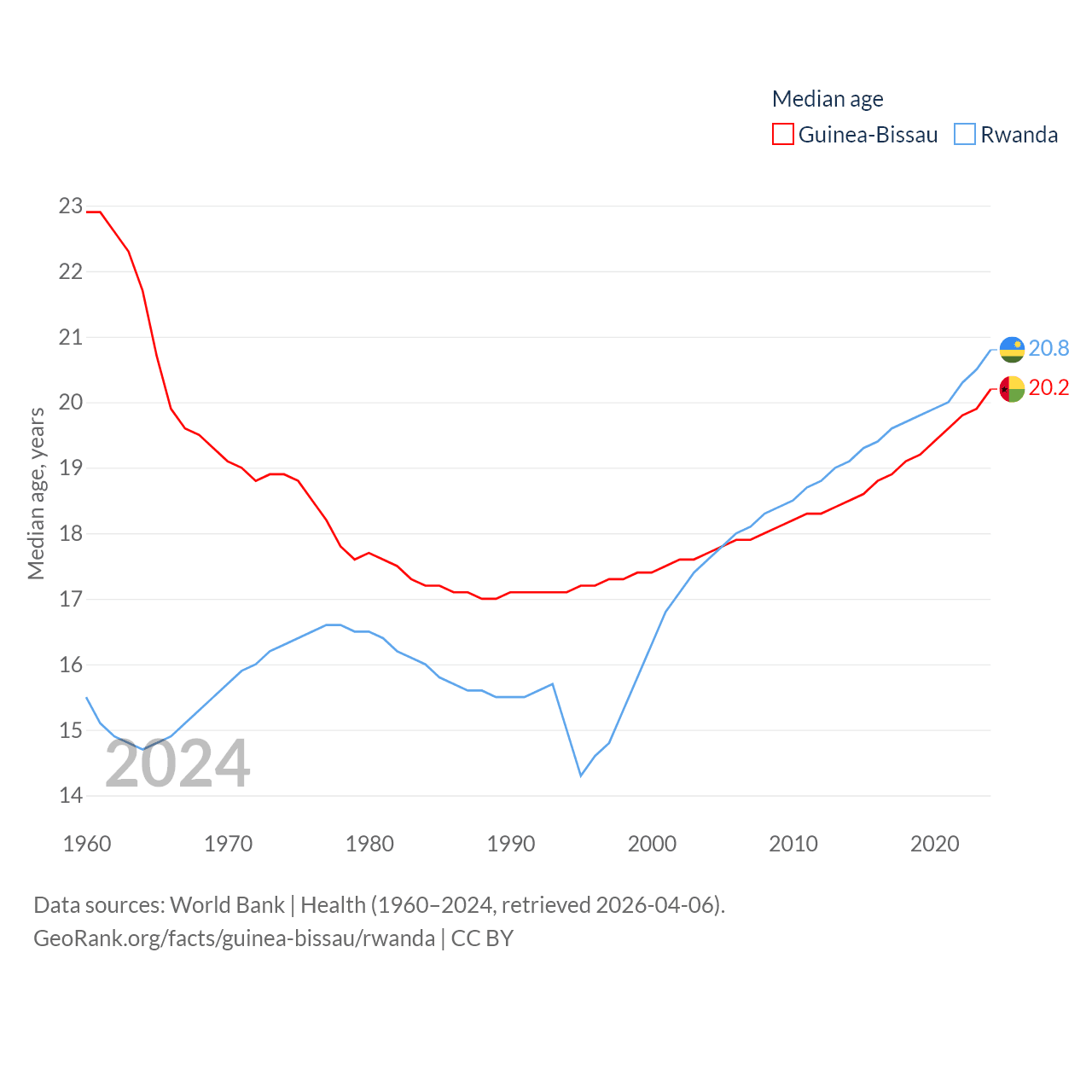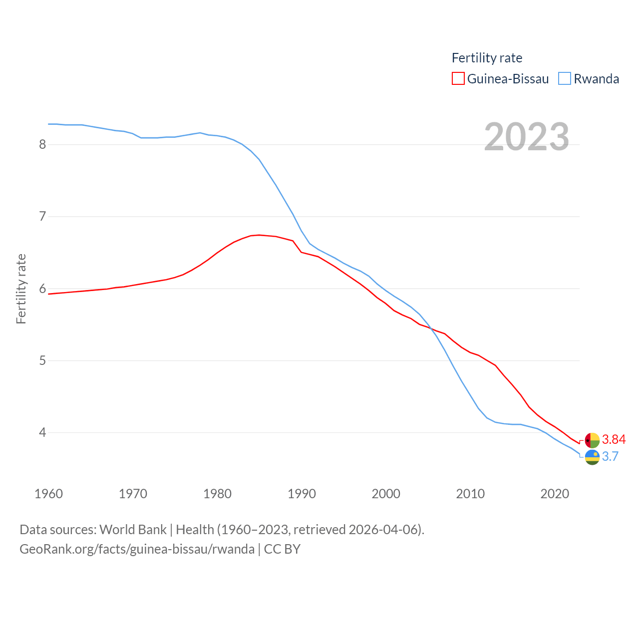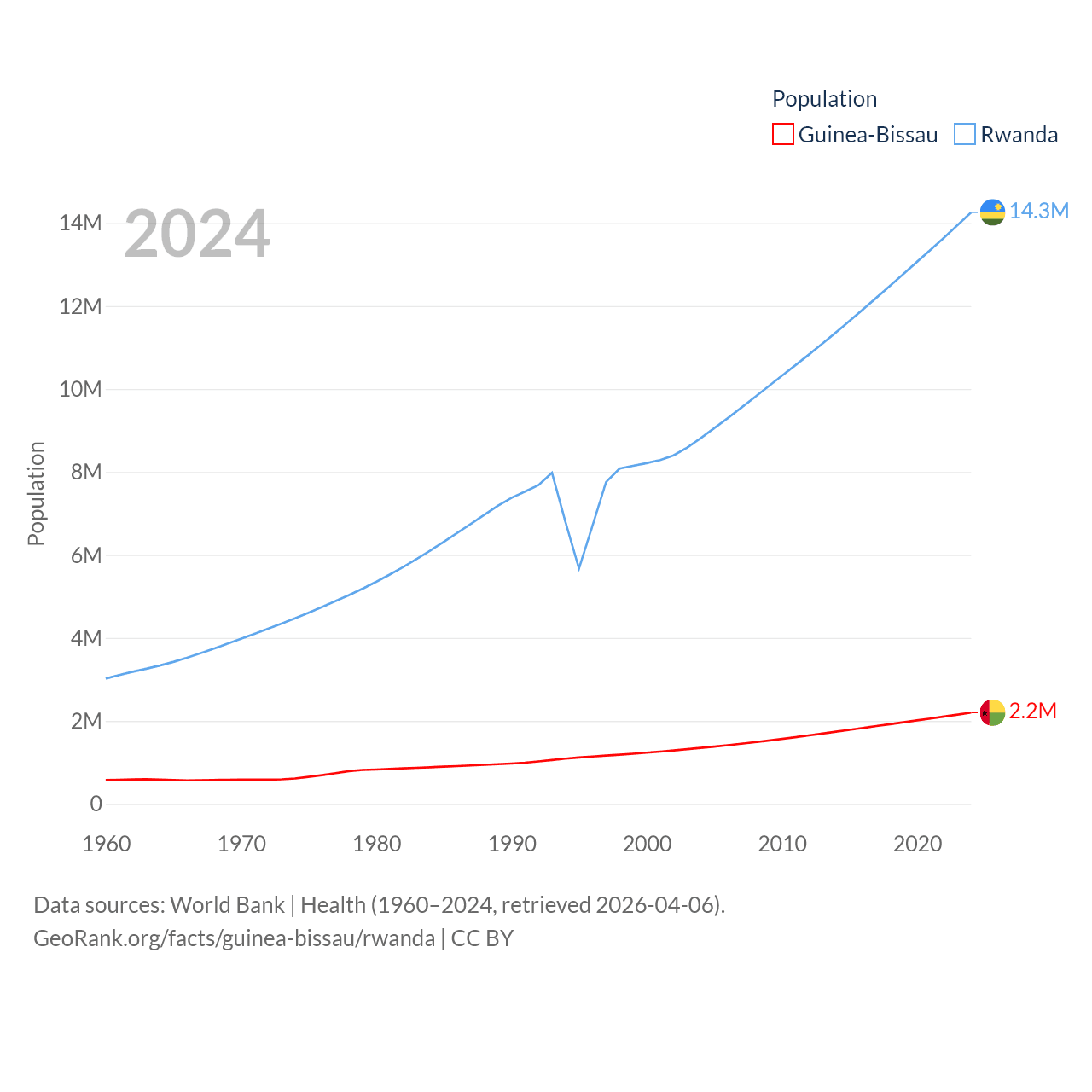 Guinea-Bissau has a population of 2.2M (ranked 146/197), compared with 14.3M in Rwanda (ranked 77/197). Guinea-Bissau's land area is 10,857 sq mi versus 9,525 sq mi for Rwanda (ranked 139th vs. 146th).