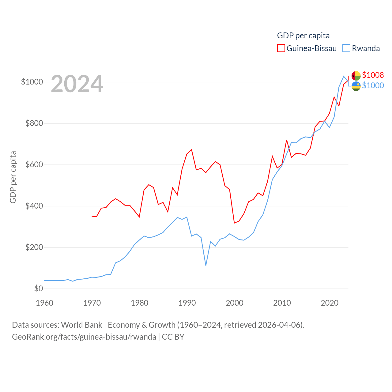 By GDP, Guinea-Bissau ranks 176/197 ($2.22B) and Rwanda ranks 144/197 ($14.3B). By GDP per capita, Guinea-Bissau ranks 177/197 ($1,008), while Rwanda ranks 178/197 ($1,000).