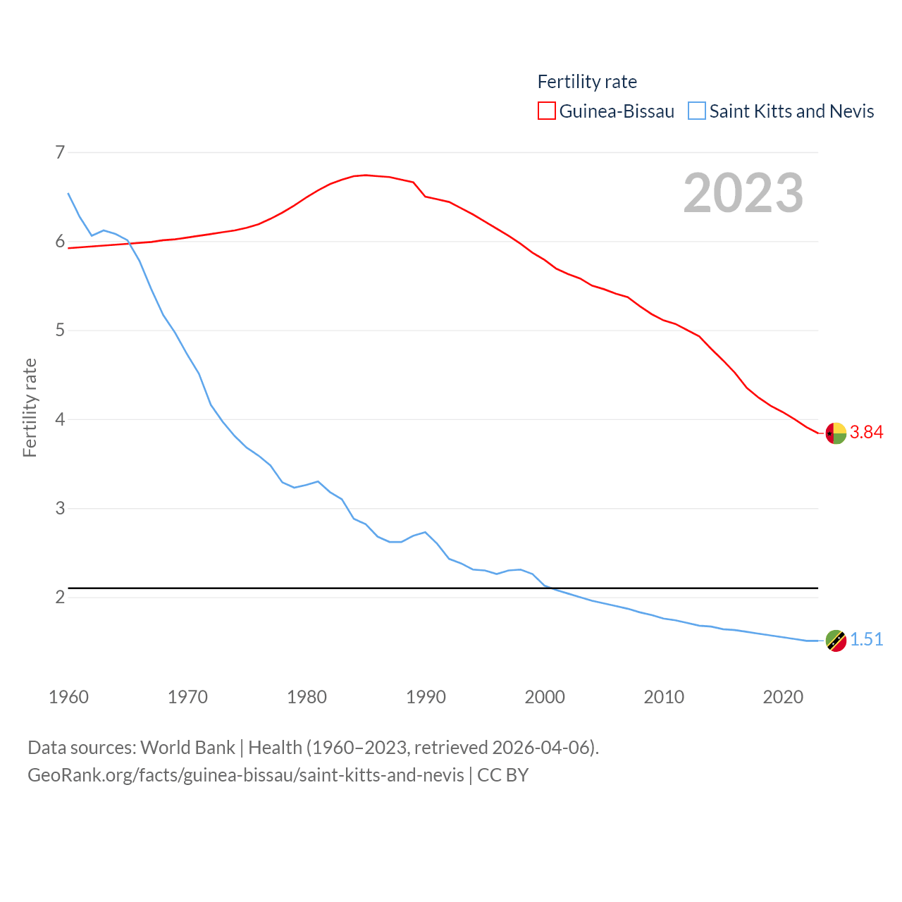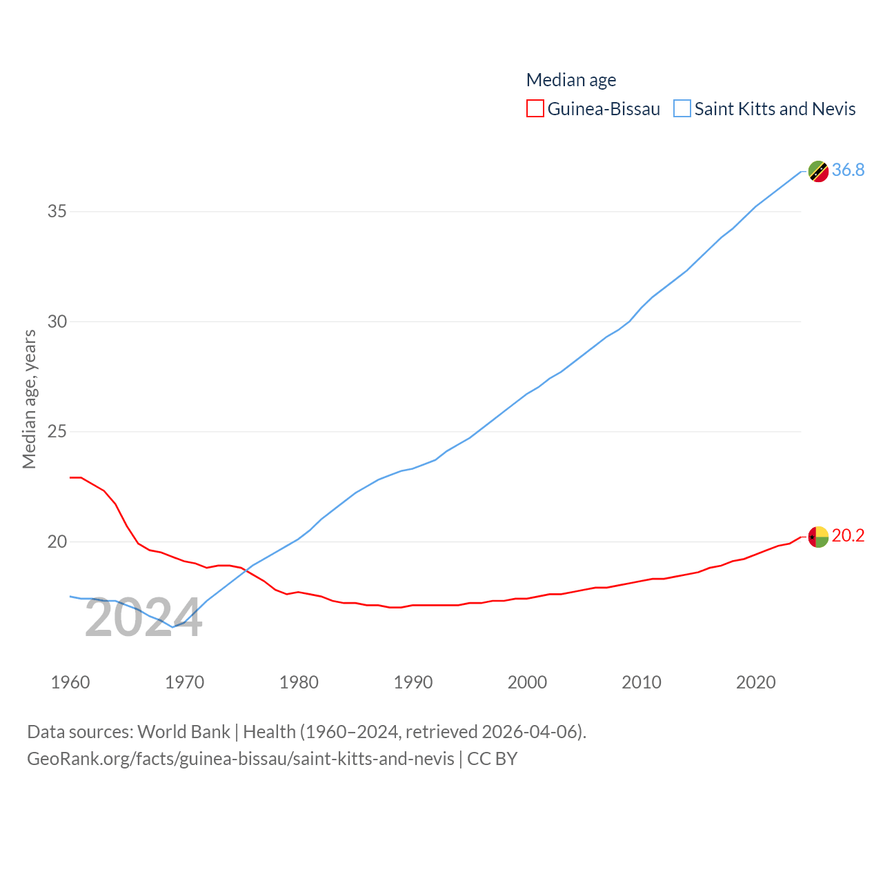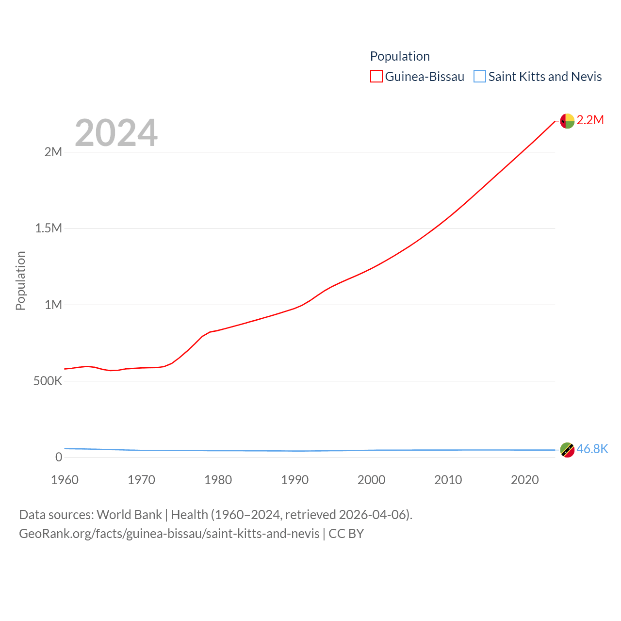 Guinea-Bissau has a population of 2.2M (ranked 146/197), compared with 46.8K in Saint Kitts and Nevis (ranked 189/197). Guinea-Bissau's land area is 10,857 sq mi versus 100.4 sq mi for Saint Kitts and Nevis (ranked 139th vs. 189th).