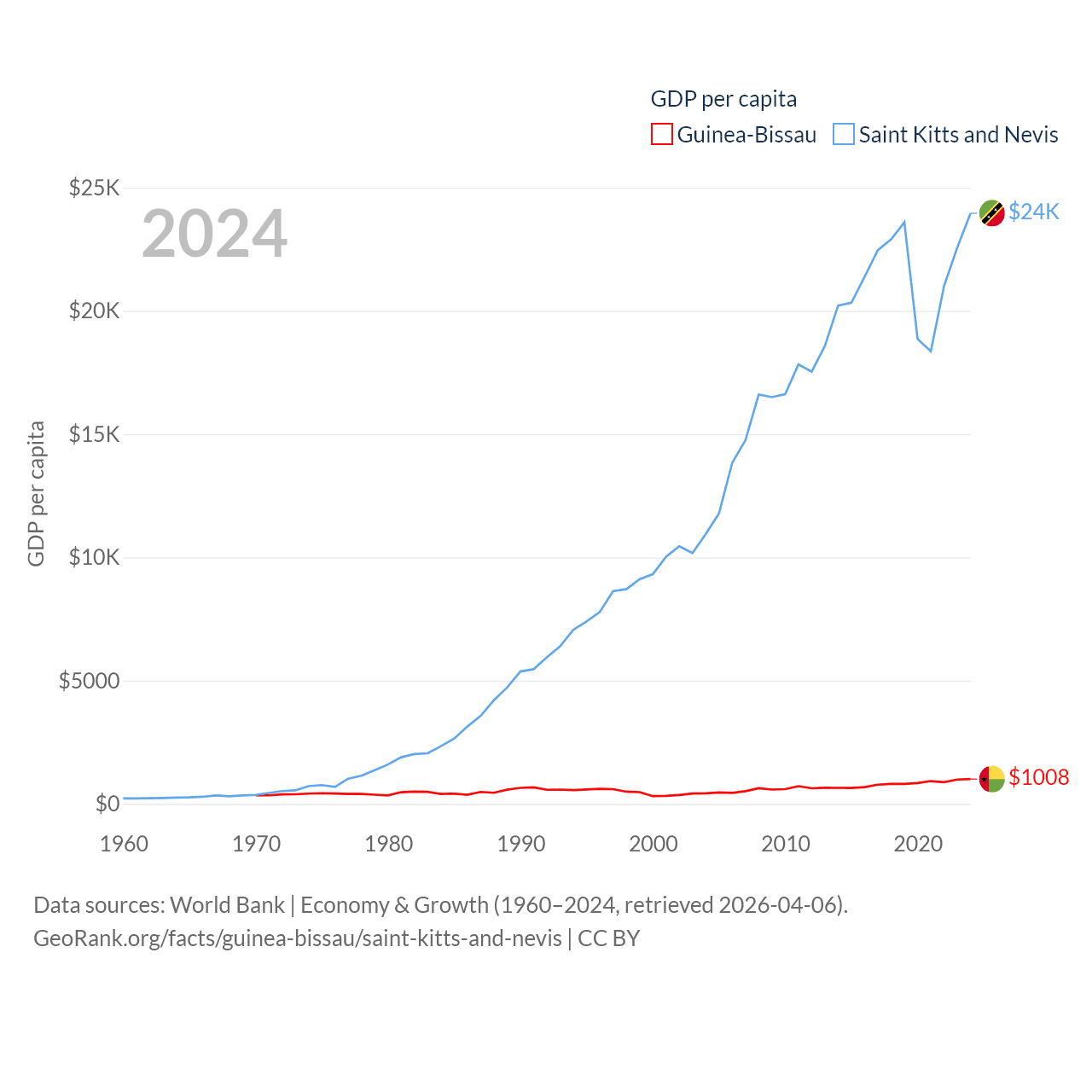 By GDP, Guinea-Bissau ranks 176/197 ($2.22B) and Saint Kitts and Nevis ranks 187/197 ($1.12B). By GDP per capita, Guinea-Bissau ranks 177/197 ($1,008), while Saint Kitts and Nevis ranks 51/197 ($23,961).