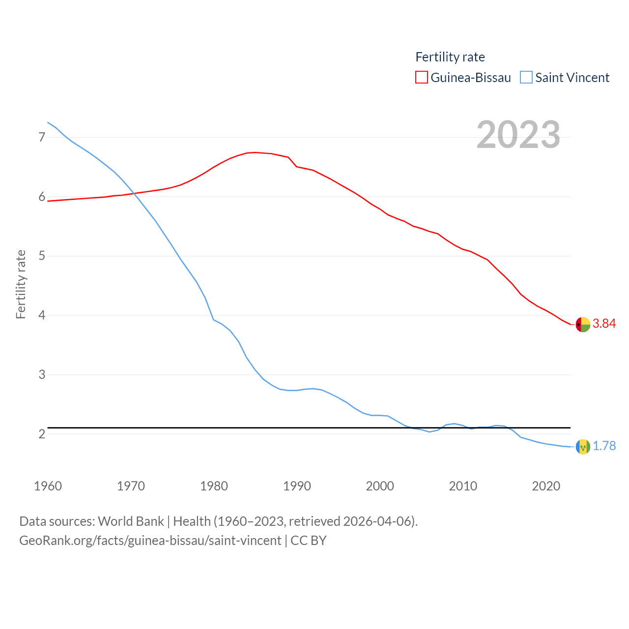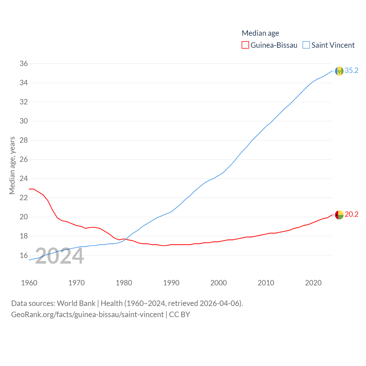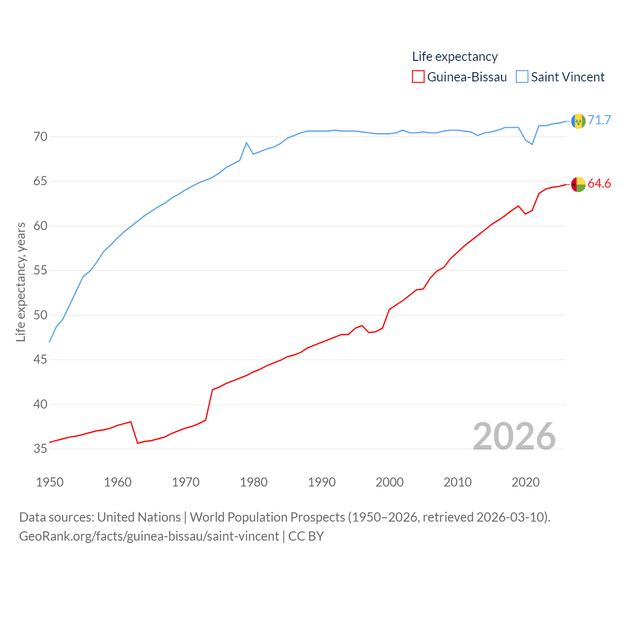 Guinea-Bissau has a population of 2.2M (ranked 146/197), compared with 101K in Saint Vincent (ranked 184/197). Guinea-Bissau's land area is 10,857 sq mi versus 150.6 sq mi for Saint Vincent (ranked 139th vs. 185th).