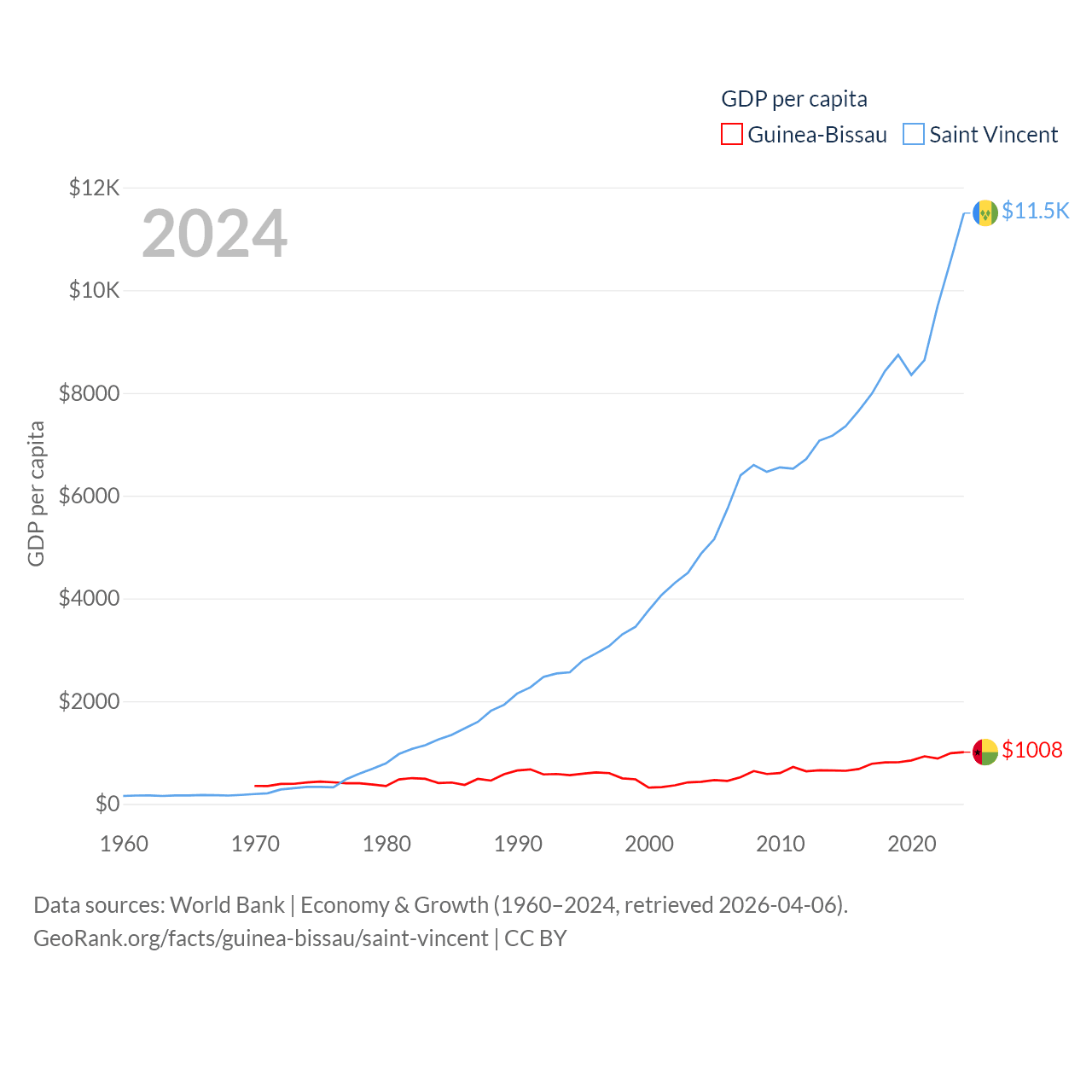 By GDP, Guinea-Bissau ranks 176/197 ($2.22B) and Saint Vincent ranks 186/197 ($1.16B). By GDP per capita, Guinea-Bissau ranks 177/197 ($1,008), while Saint Vincent ranks 81/197 ($11,501).