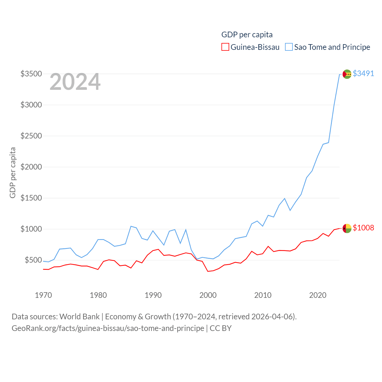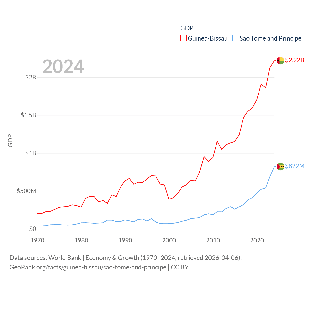 By GDP, Guinea-Bissau ranks 176/197 ($2.22B) and Sao Tome and Principe ranks 189/197 ($822M). By GDP per capita, Guinea-Bissau ranks 177/197 ($1,008), while Sao Tome and Principe ranks 134/197 ($3,491).