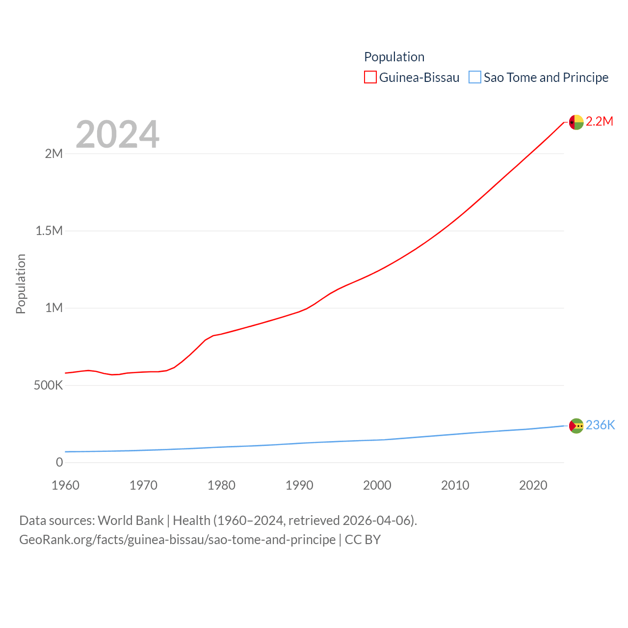Guinea-Bissau has a population of 2.2M (ranked 146/197), compared with 236K in Sao Tome and Principe (ranked 176/197). Guinea-Bissau's land area is 10,857 sq mi versus 371 sq mi for Sao Tome and Principe (ranked 139th vs. 172nd).
