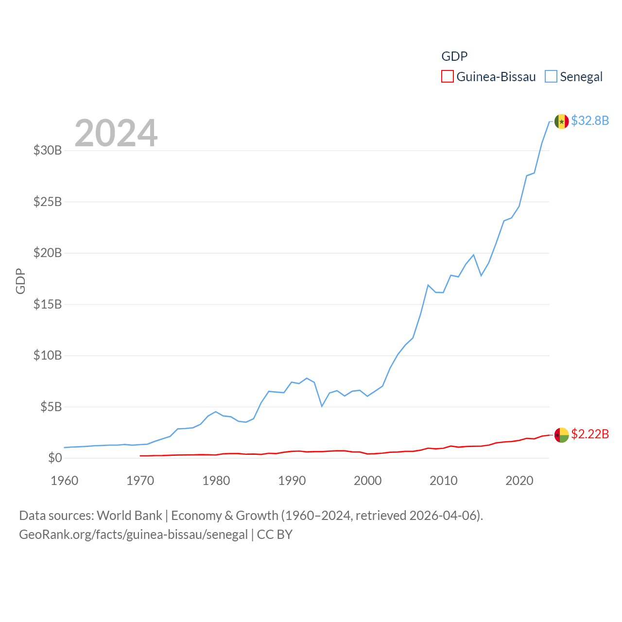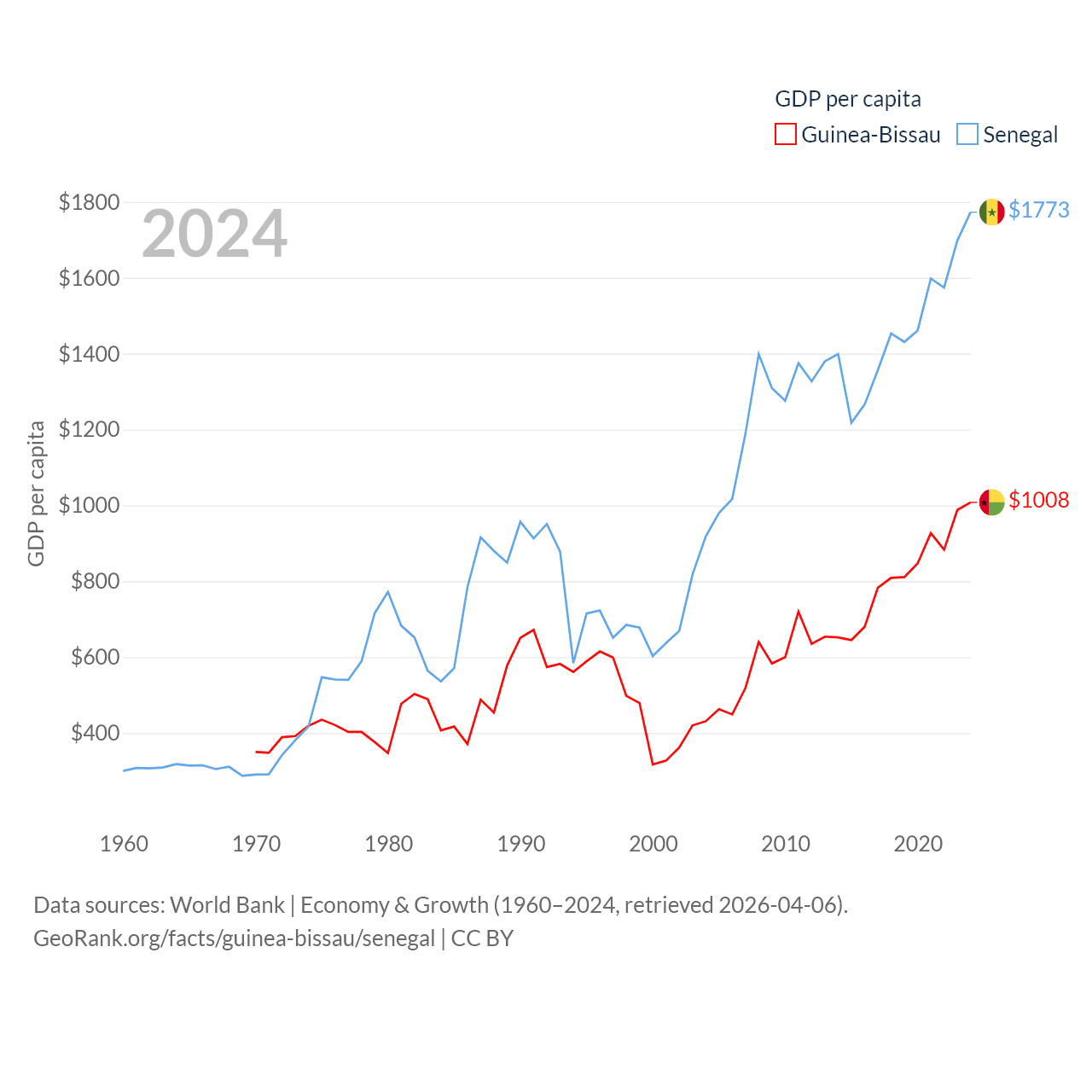 By GDP, Guinea-Bissau ranks 176/197 ($2.22B) and Senegal ranks 109/197 ($32.8B). By GDP per capita, Guinea-Bissau ranks 177/197 ($1,008), while Senegal ranks 159/197 ($1,773).