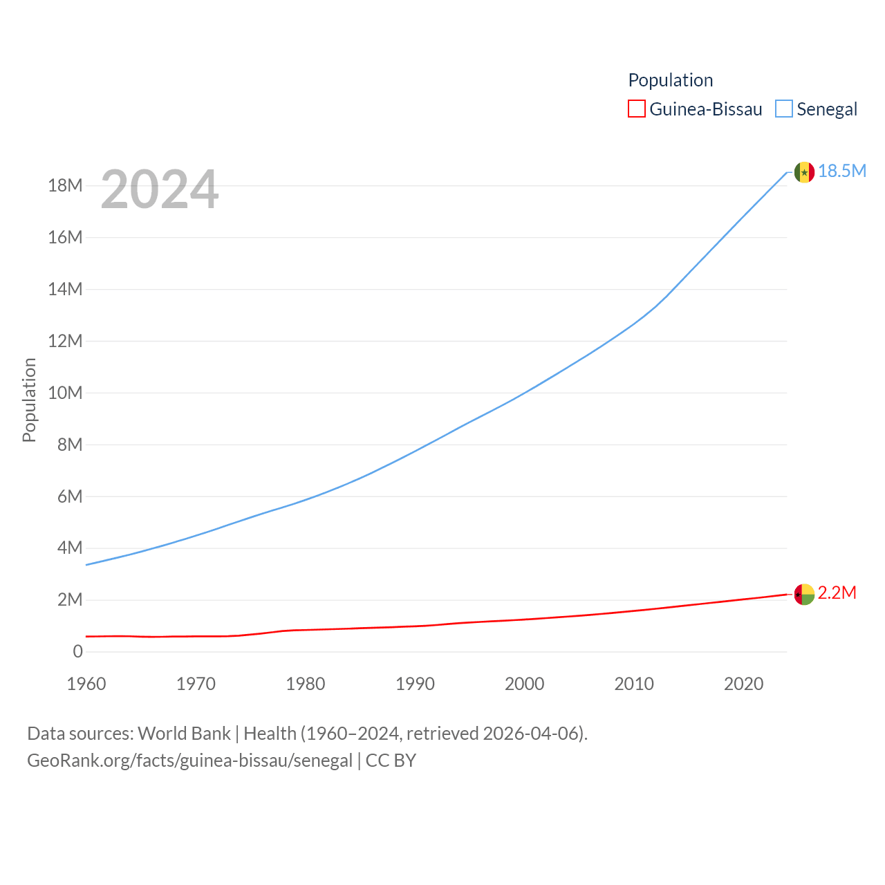 Guinea-Bissau has a population of 2.2M (ranked 146/197), compared with 18.5M in Senegal (ranked 69/197). Guinea-Bissau's land area is 10,857 sq mi versus 74,336 sq mi for Senegal (ranked 139th vs. 85th).