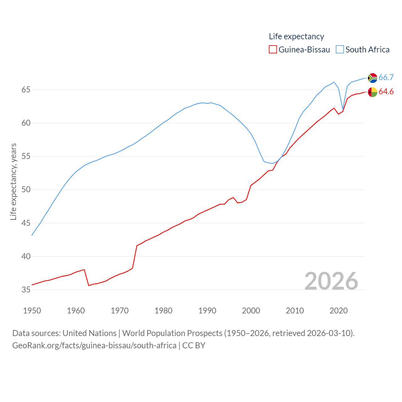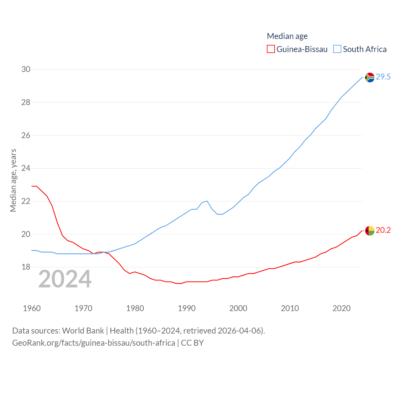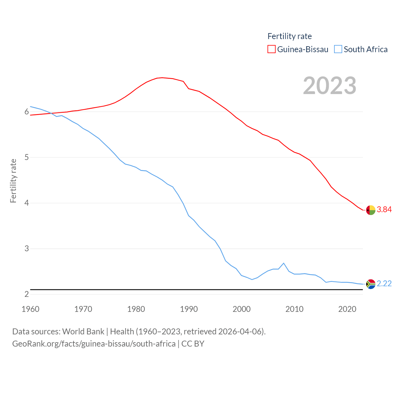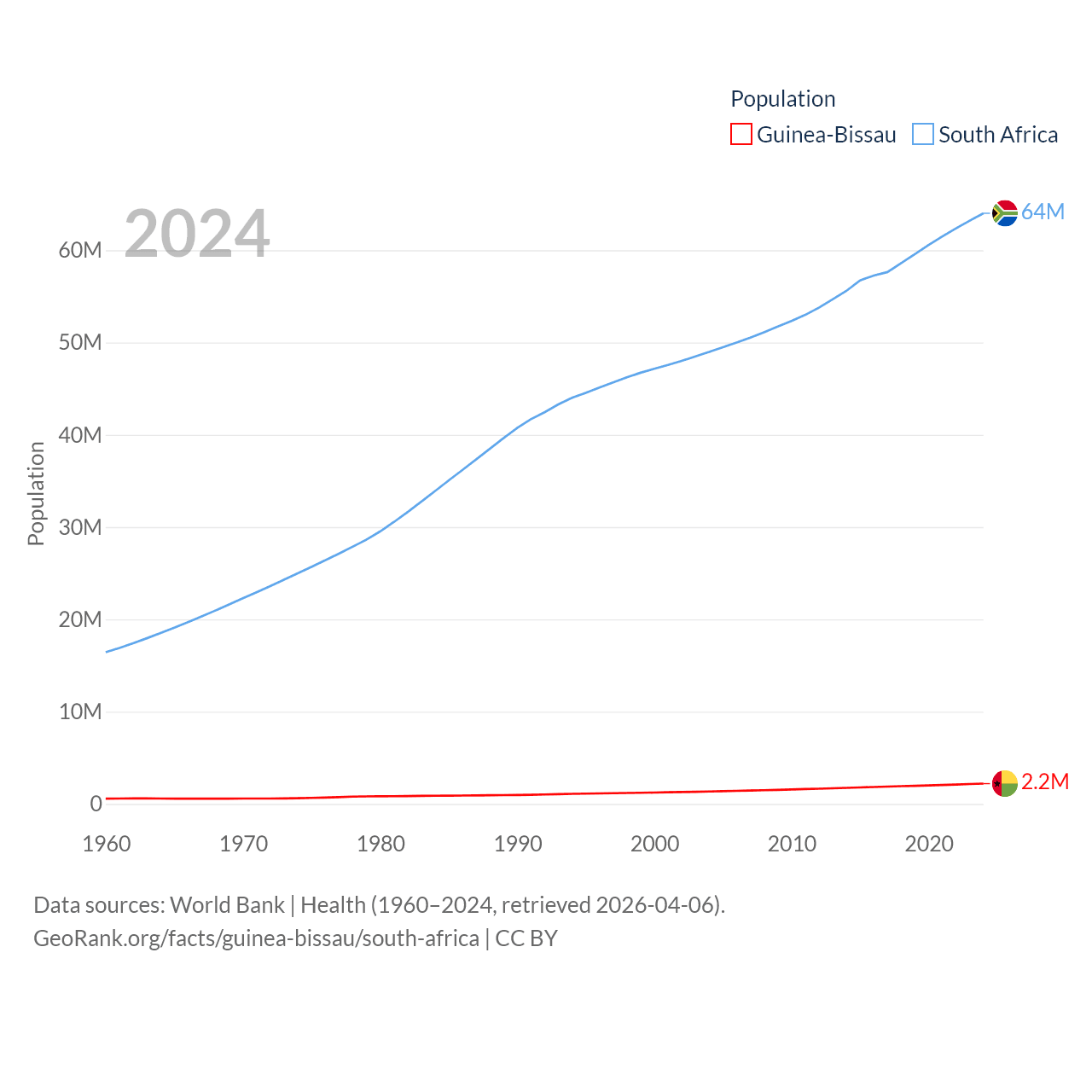 Guinea-Bissau has a population of 2.2M (ranked 146/197), compared with 64M in South Africa (ranked 24/197). Guinea-Bissau's land area is 10,857 sq mi versus 468,377 sq mi for South Africa (ranked 139th vs. 24th).